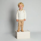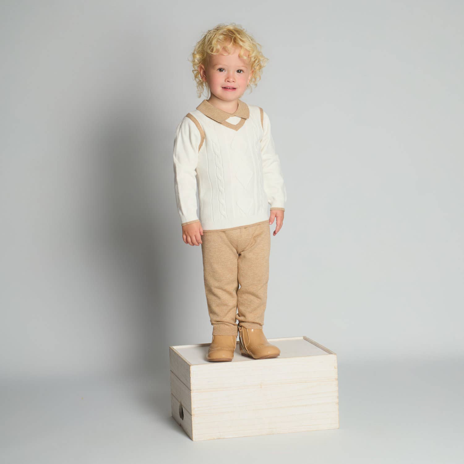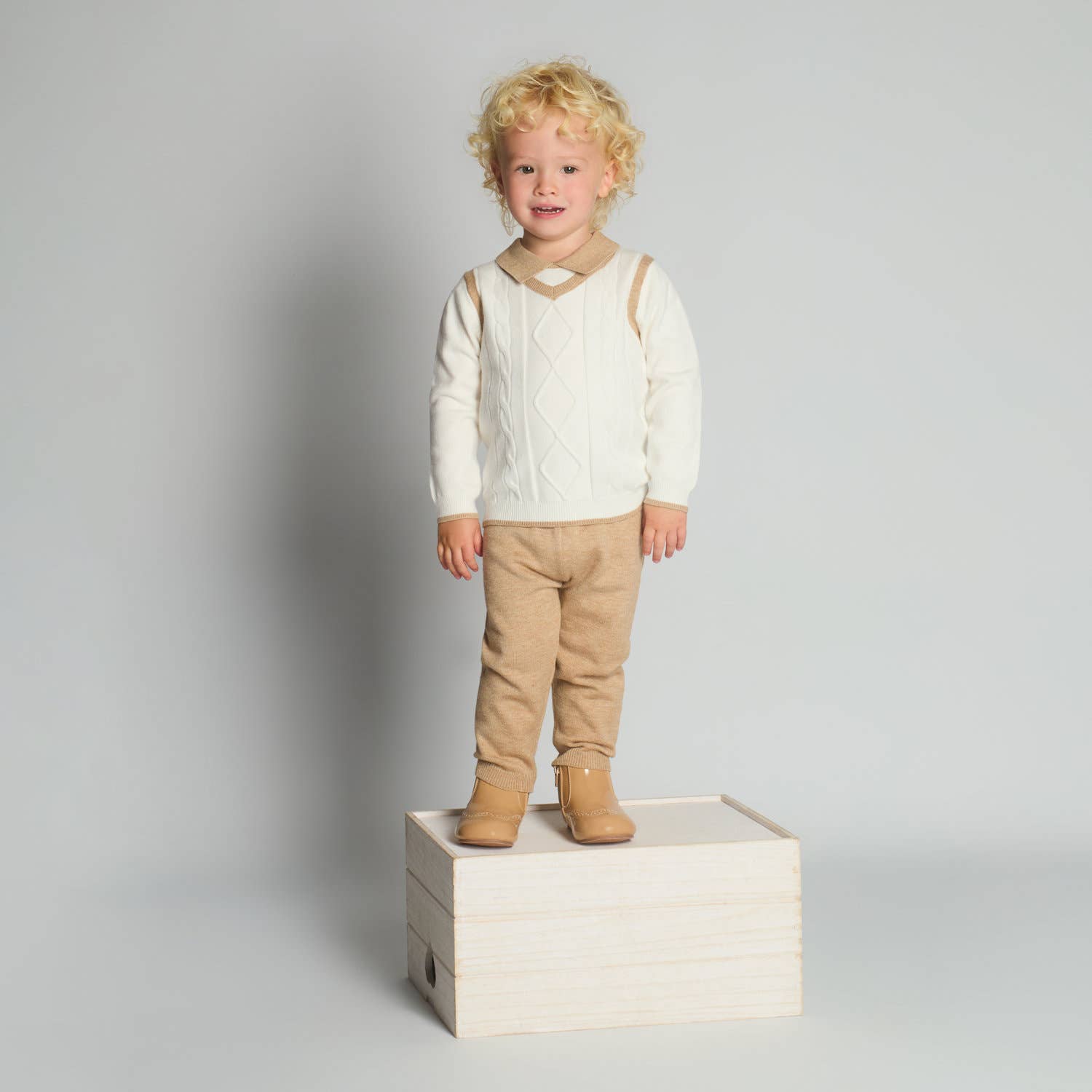 The Morris Knit Set is a timeless two-piece ensemble that combines classic charm with cozy comfort. Featuring a cream diamond-knit sweater layered over a soft collared shirt detail and matching camel knit trousers, this set gives your little gentleman a polished yet effortless look. Perfect for family photos, special gatherings, or everyday elegance, the Harrison Knit Set blends warmth, softness, and refined style for every darling occasion.