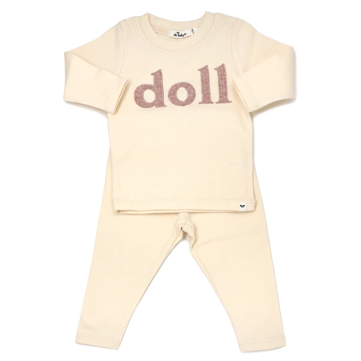 Appliqued "doll" on a soft cotton long sleeve tee with matching pants. Designed in Minnesota. Available in infant sizes.