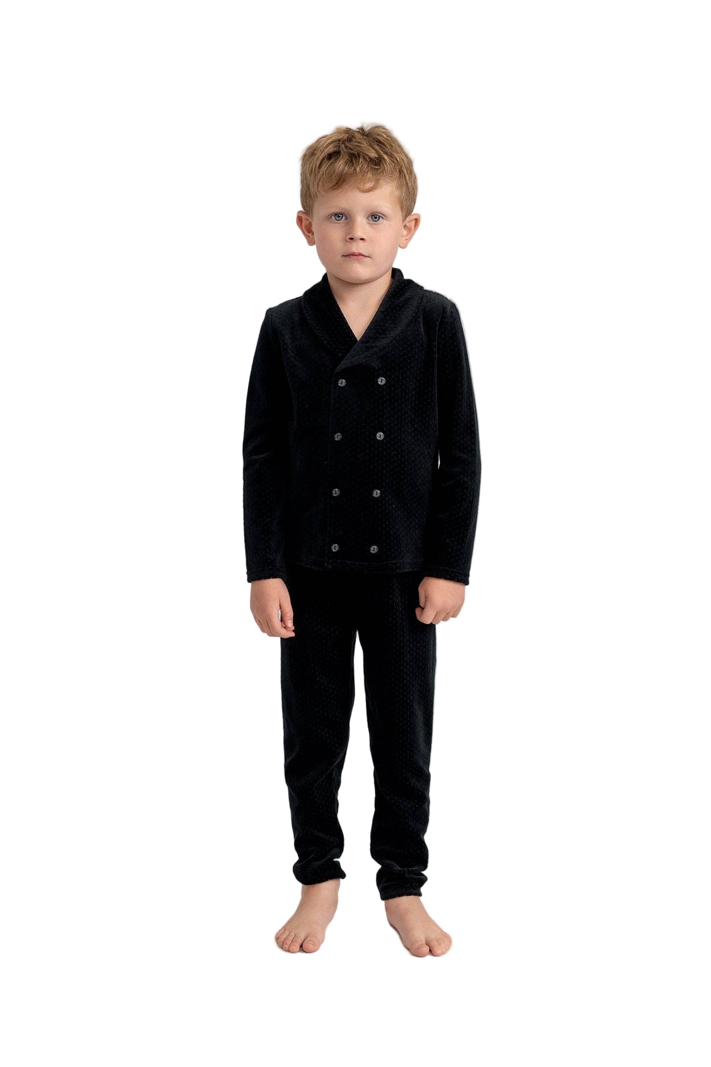 This boys' dotted velour ensemble includes a long-sleeve top featuring a faux double-breasted design and matching pants with a covered elastic waistband. Available in black, the set is crafted from 80% cotton and 20% polyester knit. For care, machine wash cold inside out, avoid chlorine bleach, and tumble dry on low.