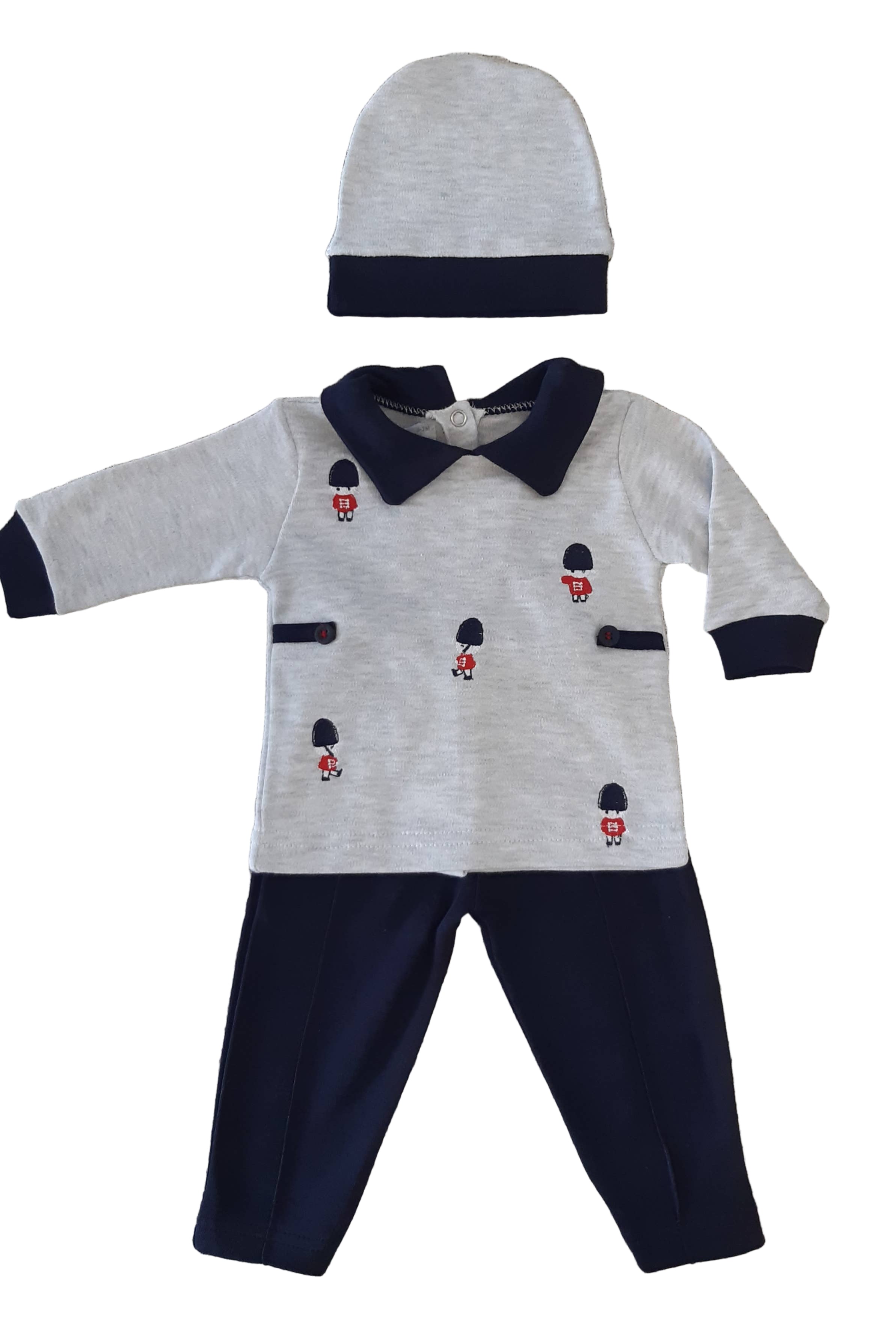 The London Guard 3-Piece Set brings playful charm and polished style to your baby boy’s wardrobe. This darling outfit includes a soft heather-gray top embroidered with tiny royal guards, navy trim with button details, matching navy pants, and a coordinating hat to complete the look. Crafted from cozy, breathable cotton, it’s perfect for everyday wear or special outings. A sweet blend of comfort and classic British flair — ideal for your little gentleman in training.
