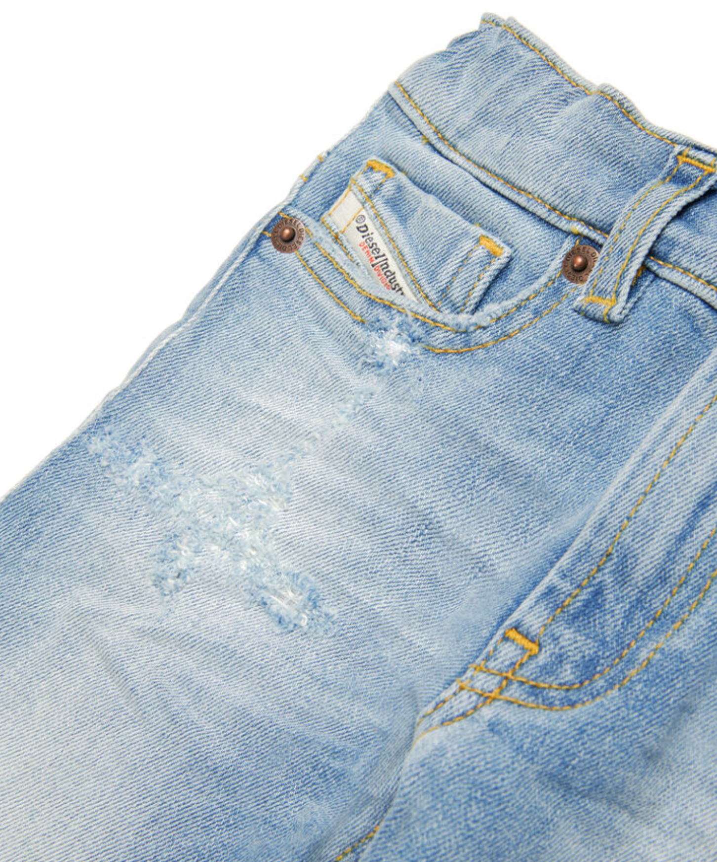Straight style with a regular fit and a casual look. Crafted from stonewashed light blue stretch denim, featuring 3D whiskers and subtle ripped and repaired details. Hand-scraped and bleach effects enhance the lived-in look. Finished with yellow stitching.