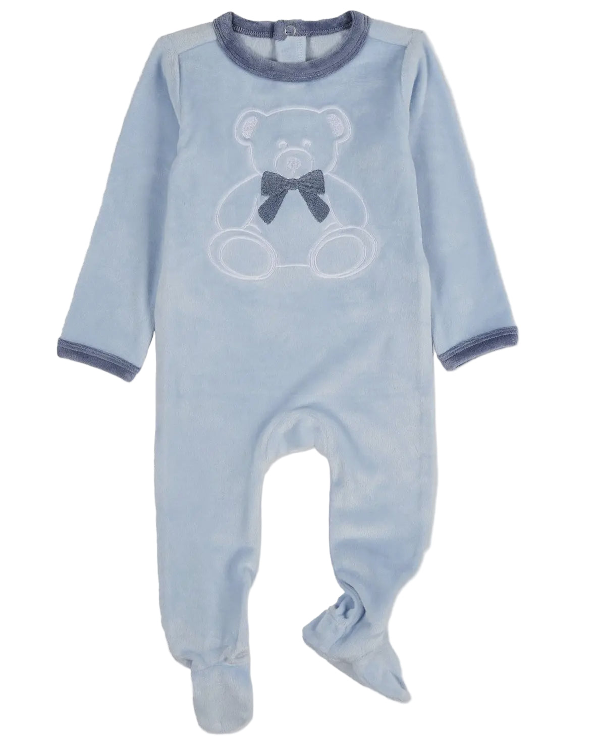 Soft, sweet, and oh-so-snuggly—this baby blue velour footed romper features a darling embroidered teddy bear with a bow for a classic touch of charm. Designed with cozy long sleeves, contrasting trim, and built-in feet, it keeps your little one warm and comfortable while looking irresistibly adorable. Perfect for cuddles, naps, or gifting to a new arrival.