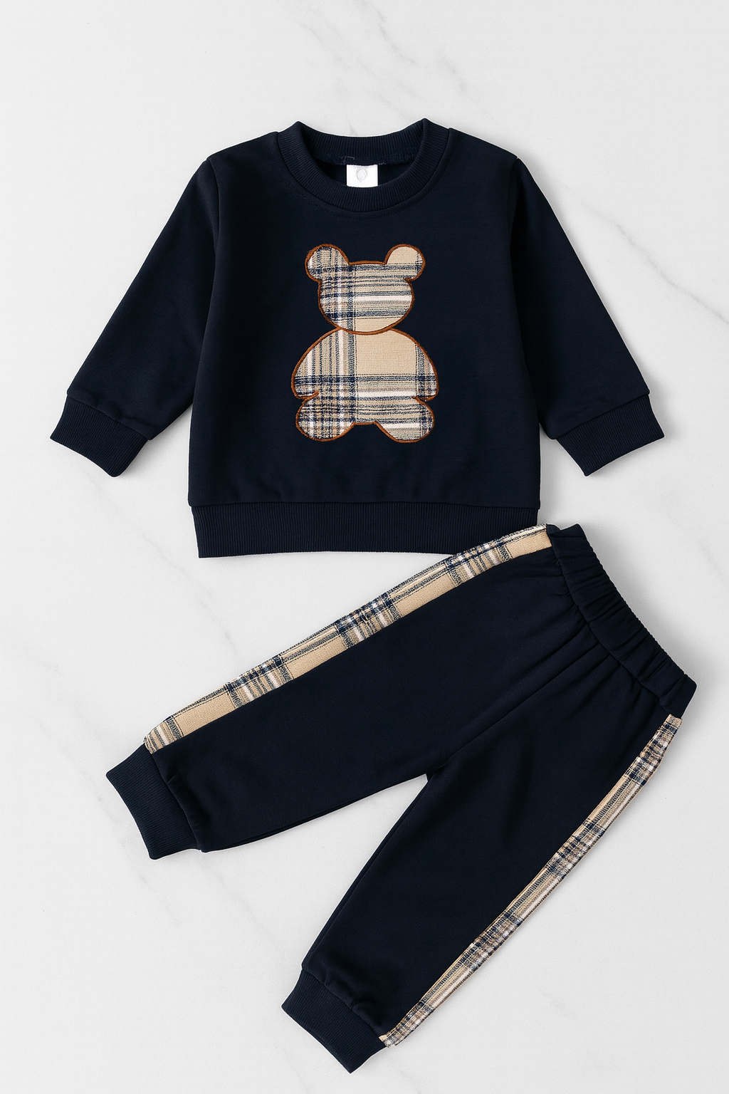 This boys' set features a sleek crewneck sweatshirt adorned with a chic teddy bear outline in Burberry-inspired plaid. Complemented by jogger-style pants with a matching plaid stripe down the leg, it combines classic elegance with comfortable design, available in timeless black and white.