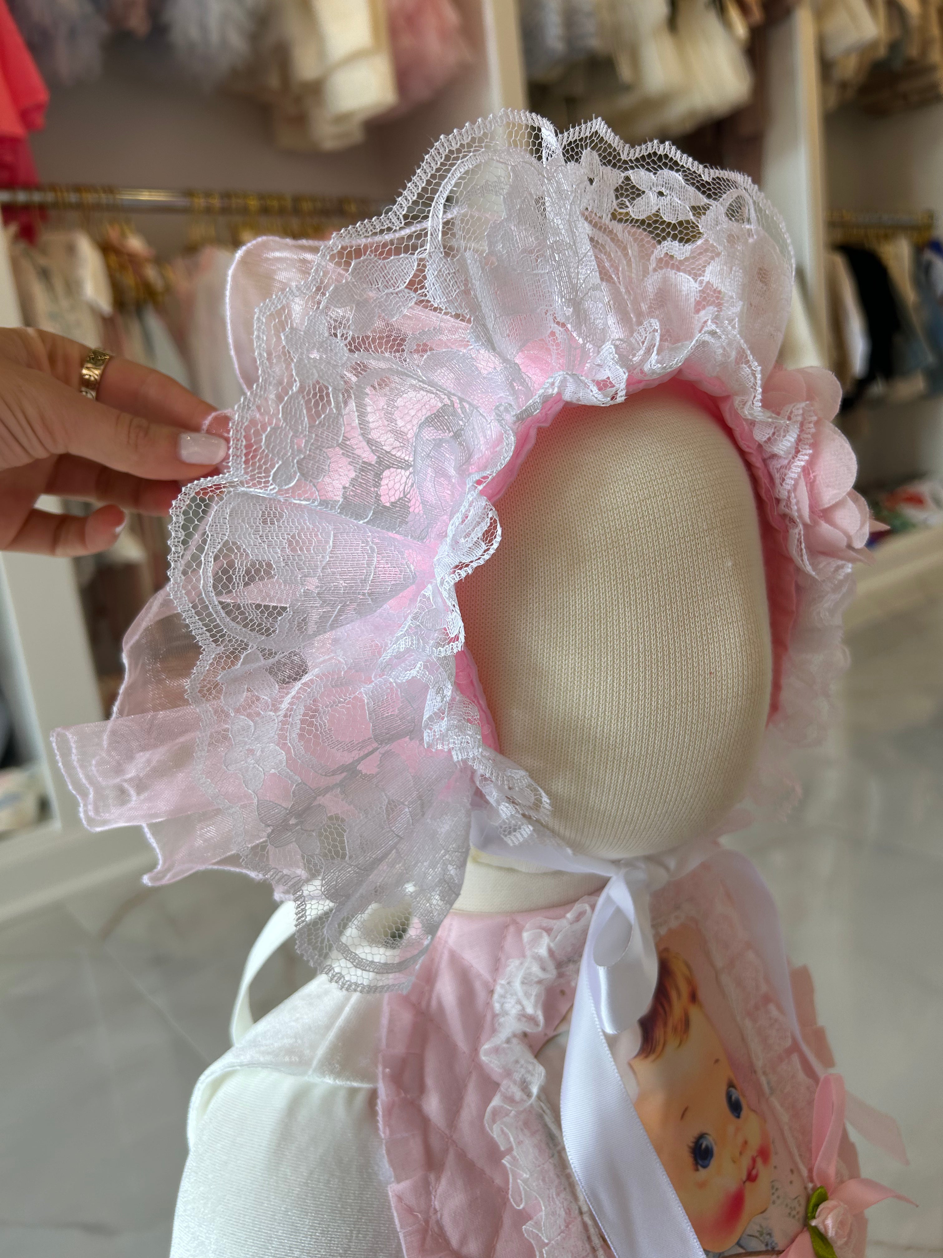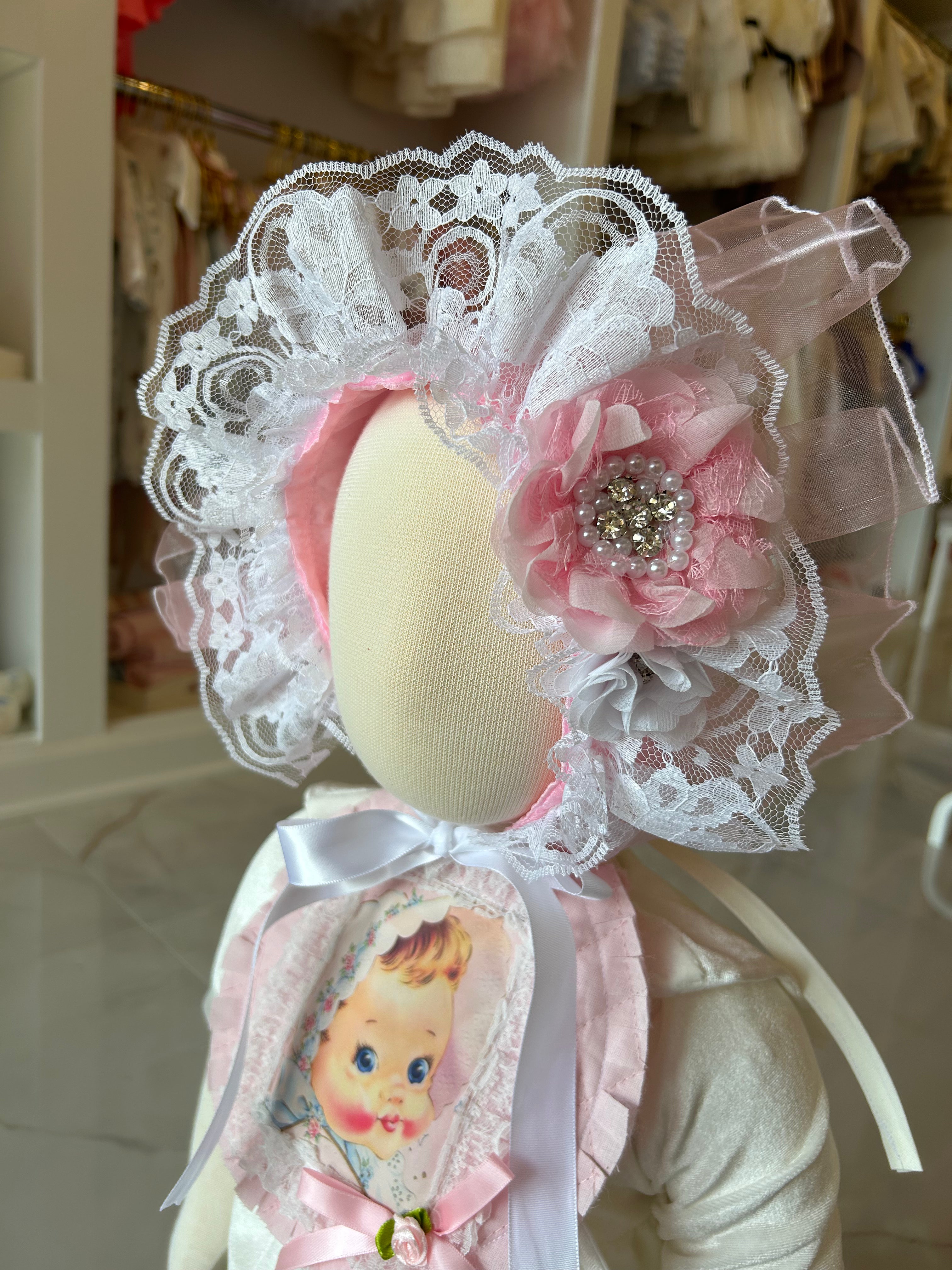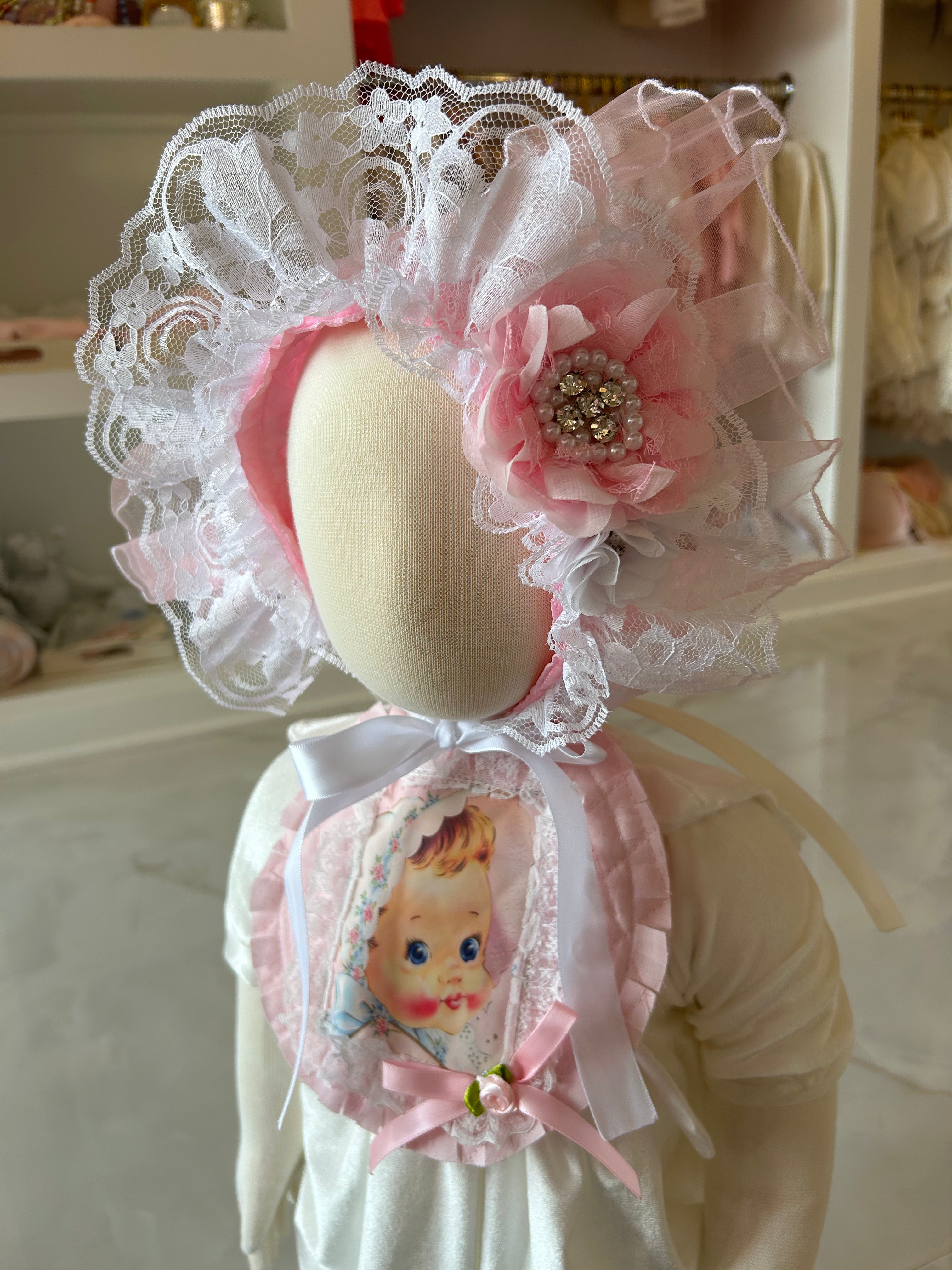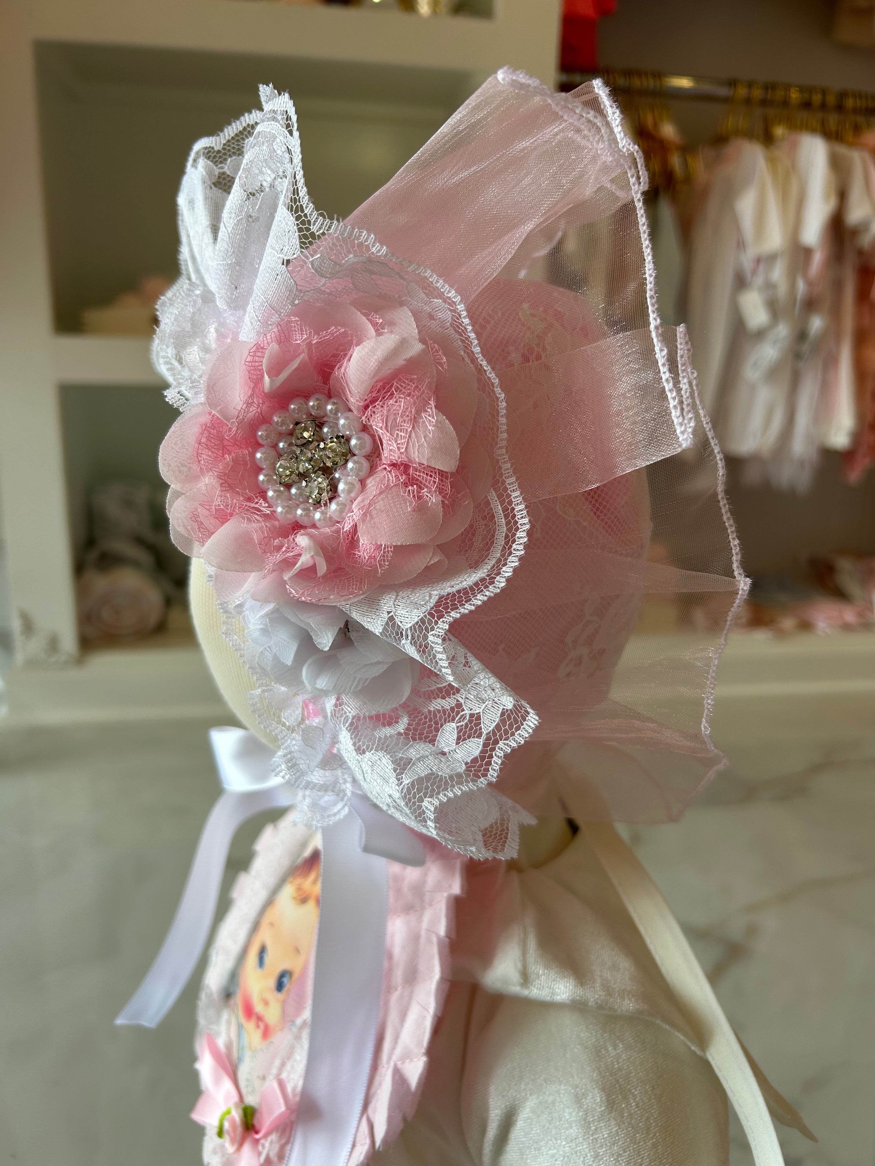 Introducing the cutest addition to your baby girl's wardrobe - the Blossom bonnet! Made with delicate lace, organza, rhinestones, and pearls, this bonnet will keep your little one looking stylish and feeling comfortable. Perfect for special occasions or everyday wear. (Pear-fect for your little bundle of joy!)