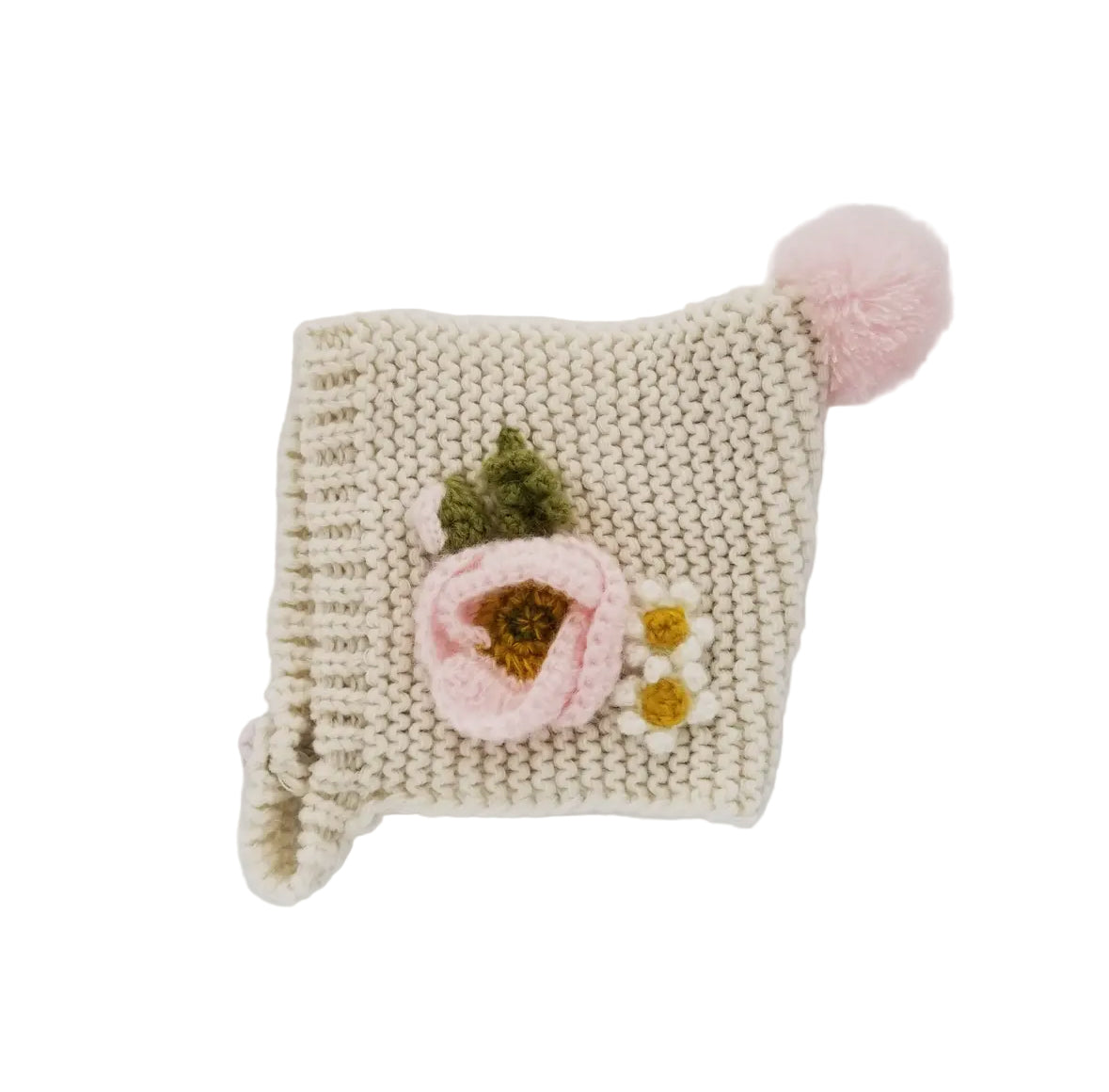 A sweet blend of vintage charm and cozy comfort, this hand-knit bonnet is adorned with a delicate crochet rose and daisy appliqué for a touch of floral elegance. Crafted in soft cream yarn with a playful pink pom on top, it ties securely under the chin to keep your little one snug and stylish. Perfect for chilly days, photo shoots, or as a keepsake piece to treasure.