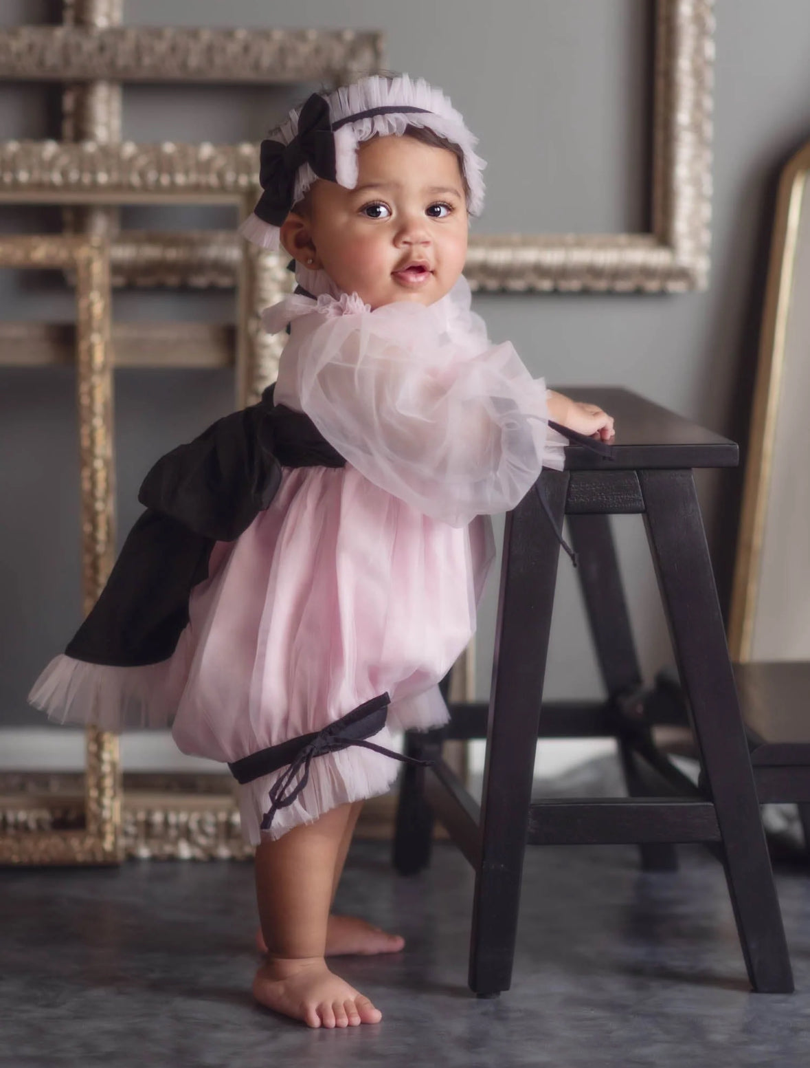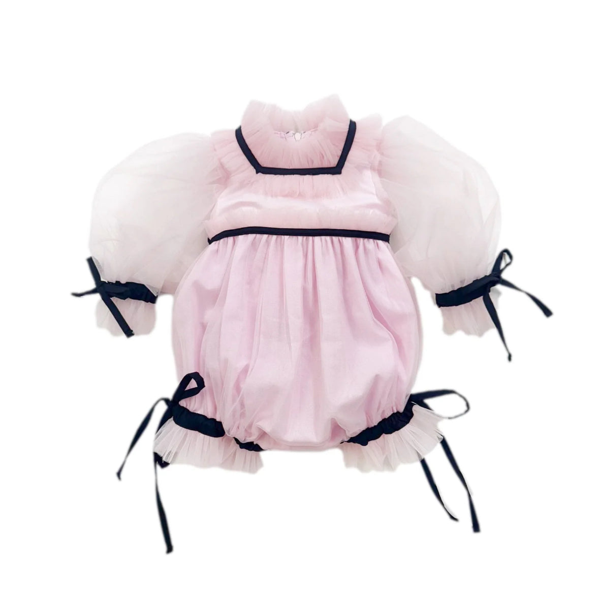 A sweet twist on classic charm, this blush-pink romper is designed with soft layers of airy tulle and delicate contrast black trim. The billowy puff sleeves and ruffled neckline add a touch of whimsy, while dainty bow ties at the wrists, legs, and waist create a perfectly polished look. Comfortable yet picture-perfect, this romper is ideal for birthdays, special occasions, or simply dressing your little one in everyday elegance.