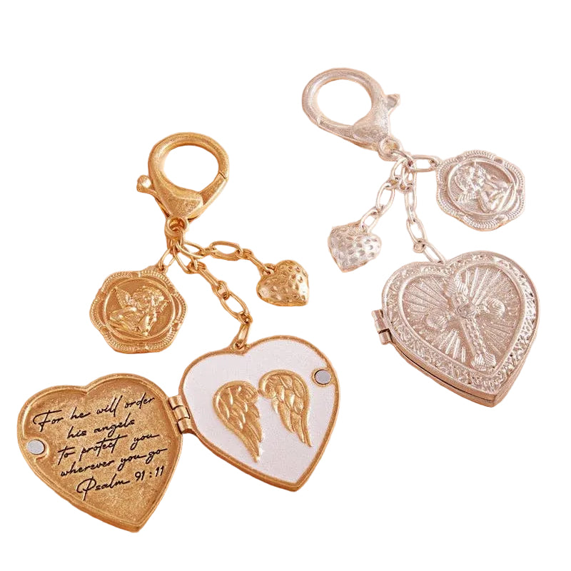 This 4.5 inch heart shaped cross with angel wing locket bag charm keychain is a beautiful and meaningful accessory. The delicate design is a symbol of love and protection, making it a perfect gift for a loved one. Made with high-quality materials, it is durable and long-lasting.