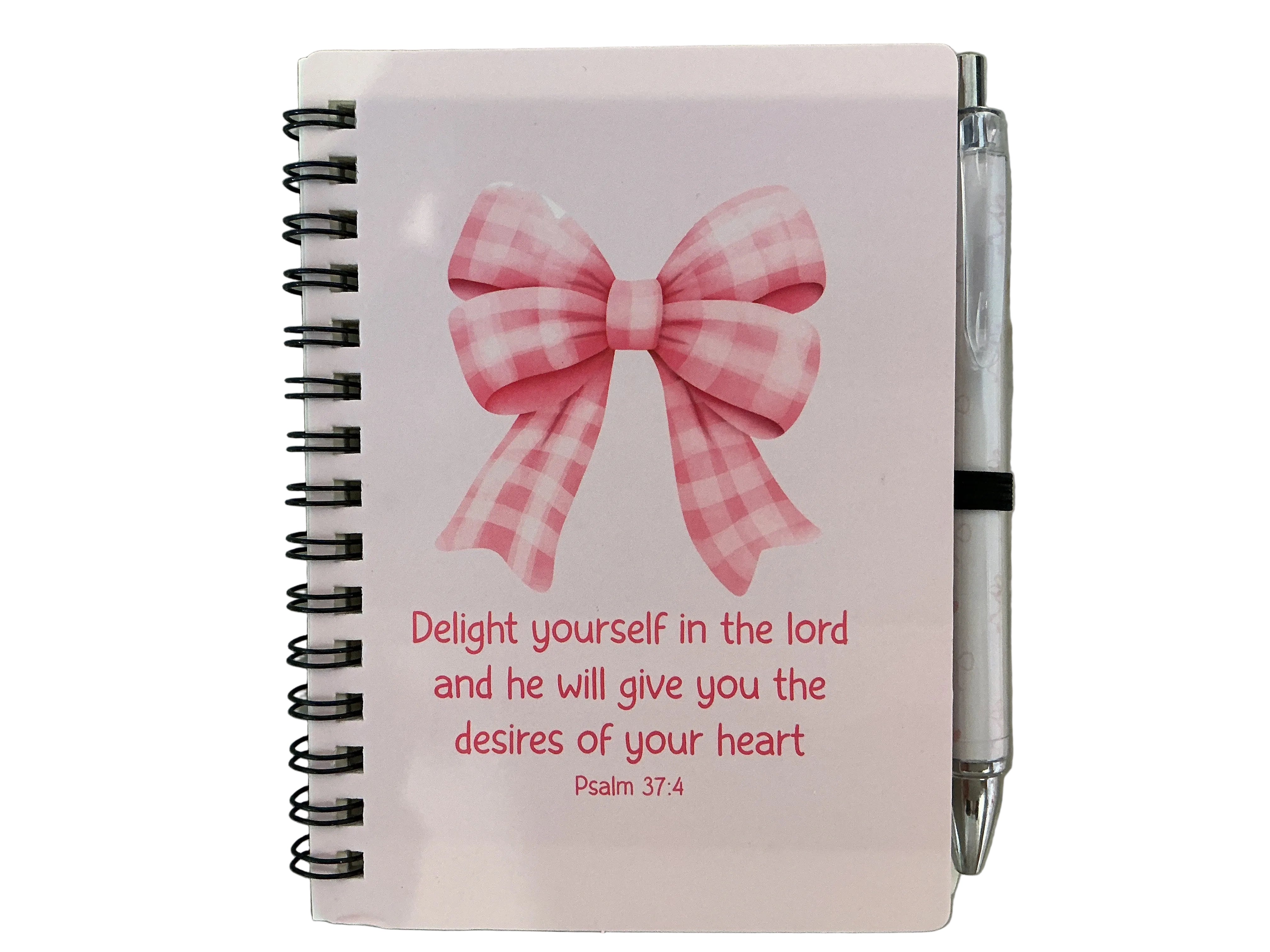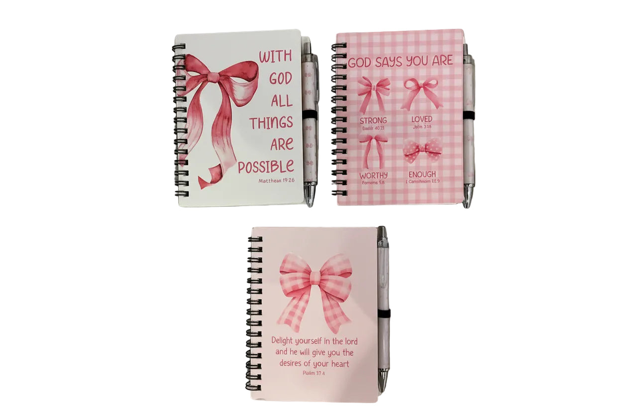 Meet the Mini Written in His Love Notebooks—your pocket-sized companions for journaling! These little books come with Christian scriptures to lift your spirits (think of them as mini cheerleaders for your soul). Plus, with a pen and sticky notes, you'll be ready to take heavenly notes straight from your favorite Bible or devotional. And did we mention the adorable pink bows? Because who doesn't love a splash of girly flair while you get your holy thoughts down?