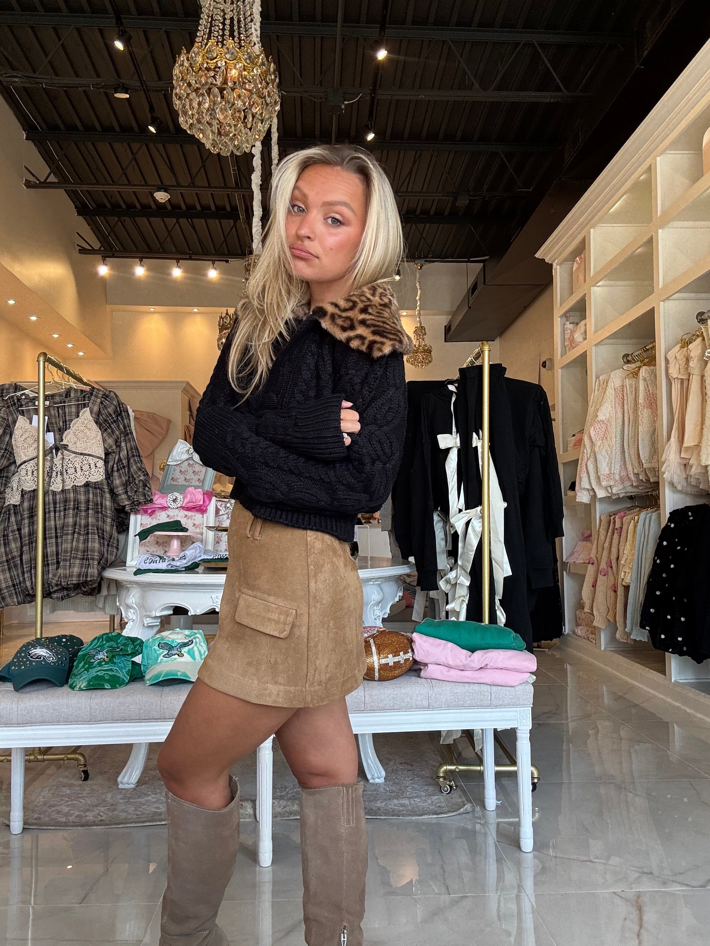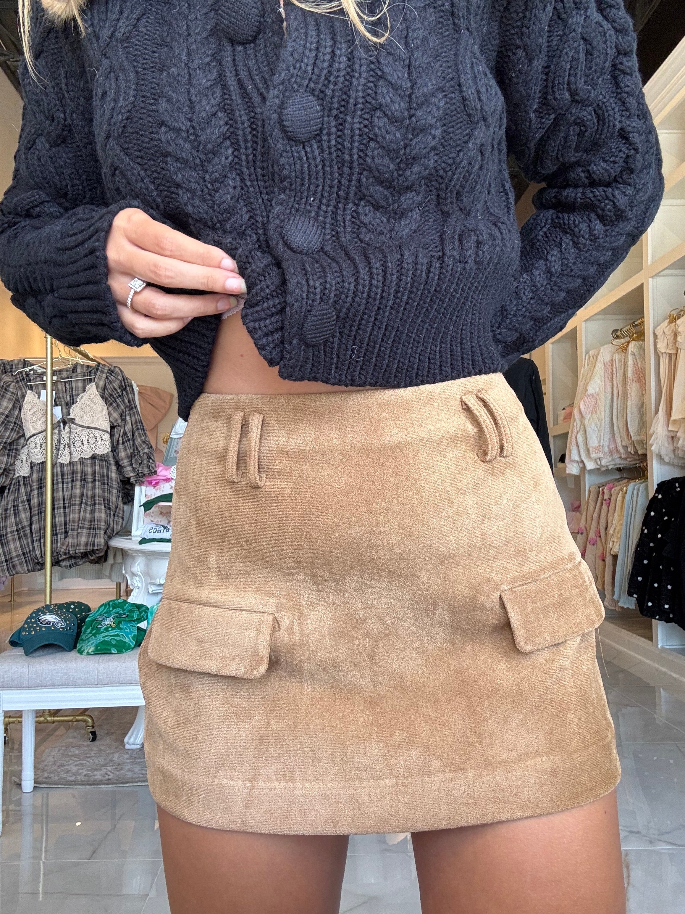 Elevate your wardrobe with the Anna Tailored Suede Mini Skirt, crafted from soft vegan suede for a luxurious feel. Featuring belt loops and stylish faux pockets, this skirt combines sophistication with modern design. Perfect for creating polished, elegant looks with effortless charm.