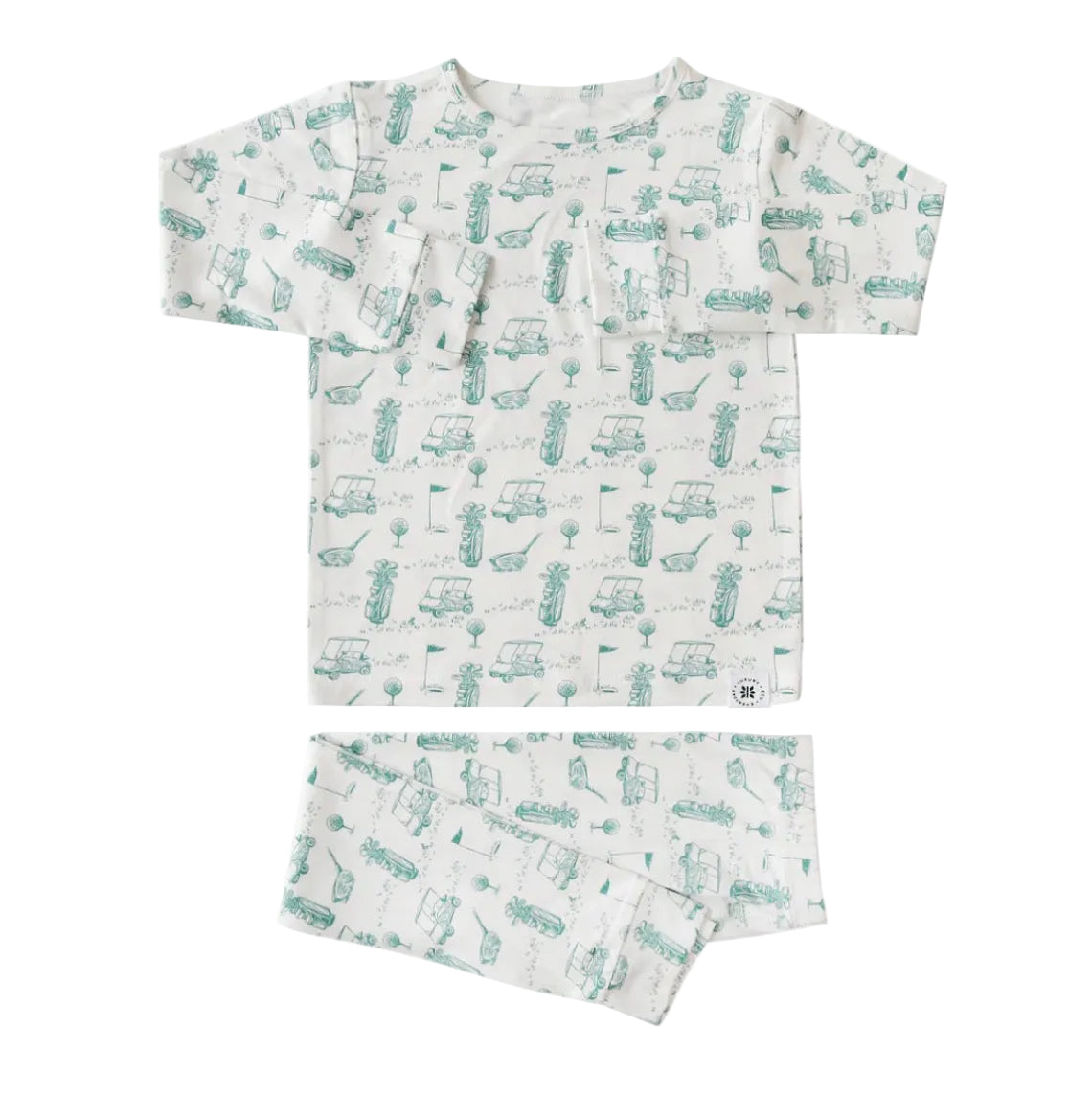 Featuring an adorable golf-inspired print with clubs, carts, and greens in a soft, calming sage tone, this set brings a playful yet classic charm to bedtime. The lightweight, stretchy material keeps your little one comfy all night long while allowing plenty of movement for playtime too.