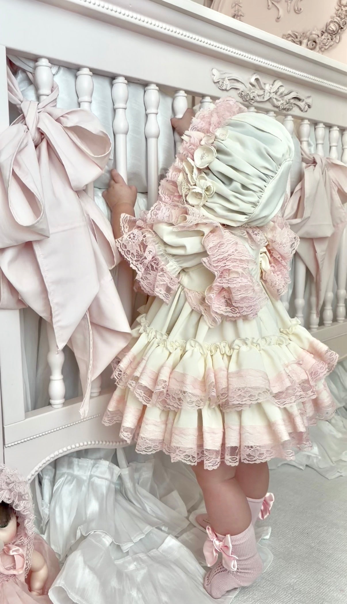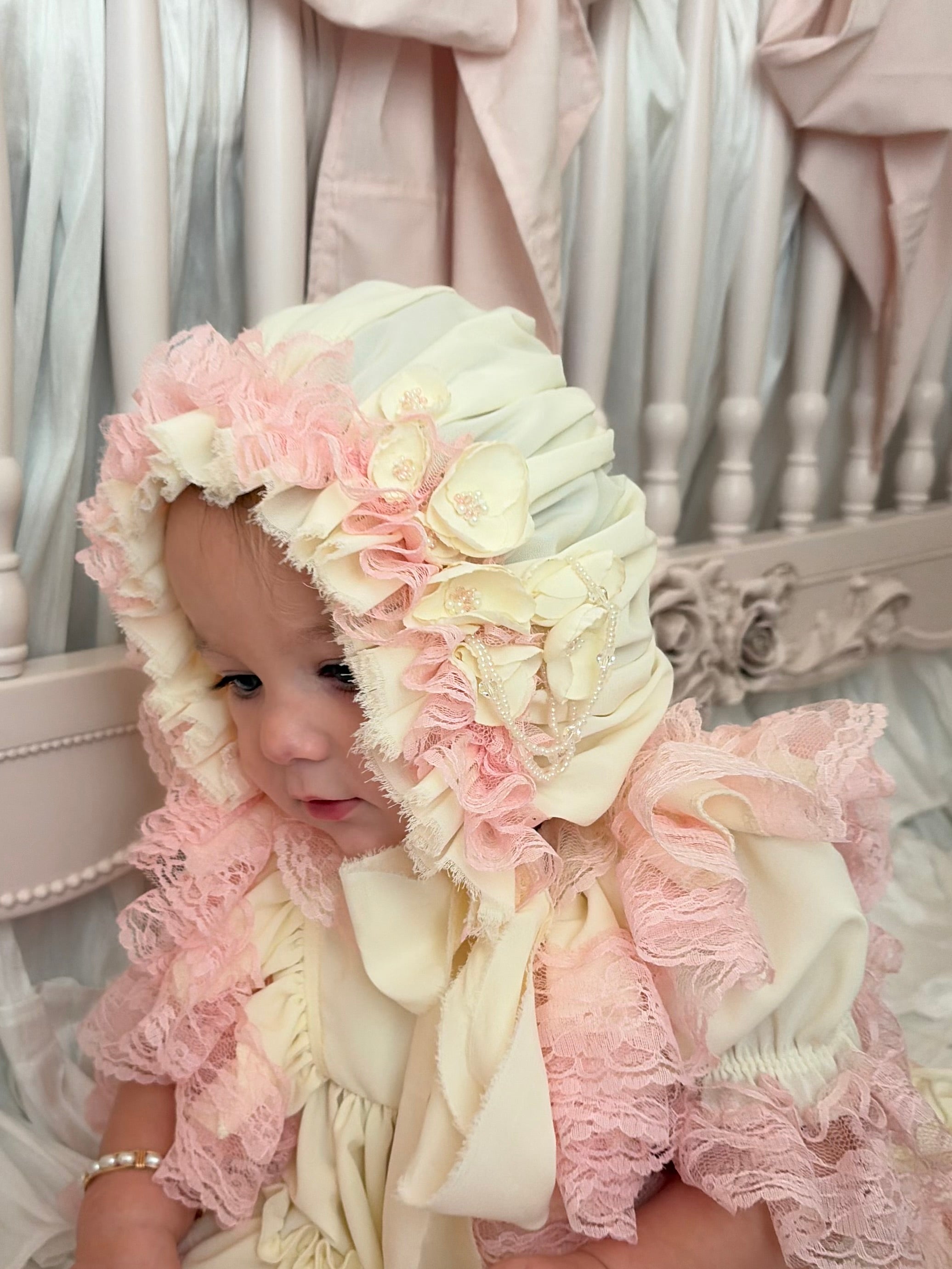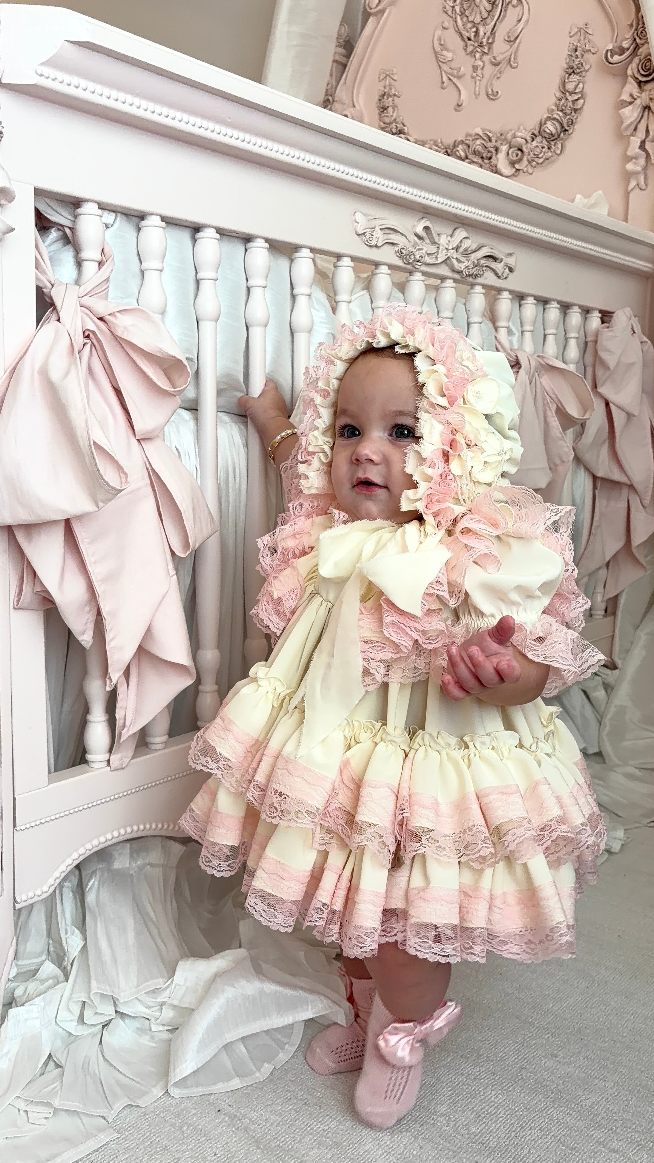 Introducing Dolled Up Couture featuring the Blushing Rose Heirloom Set is the definition of timeless baby elegance. Crafted in the softest ivory with layers of delicate blush lace, this dreamy dress features romantic ruffle sleeves, intricate floral lace trim, and a full tiered skirt made for twirling. Finished with a matching ruched bonnet adorned with lace and vintage-inspired floral appliqués, this set is perfect for portraits, special occasions, and unforgettable first moments. A true keepsake piece designed to be cherished forever.