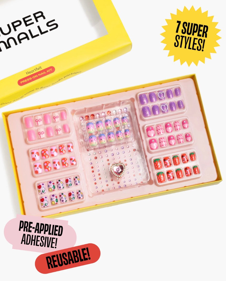 A sweet way to express their style—no polish spills in sight. The Heartfelt Press On Nail Kit includes seven different sets of reusable, heart-themed nails, each with pre-applied adhesive for easy, mess-free application. Kids can mix and match designs, decorate with gem stickers, and top it off with the included Super Smalls ring for a look that's all their own. It's a perfect activity for playdates, dress-up, or just a little everyday glam.