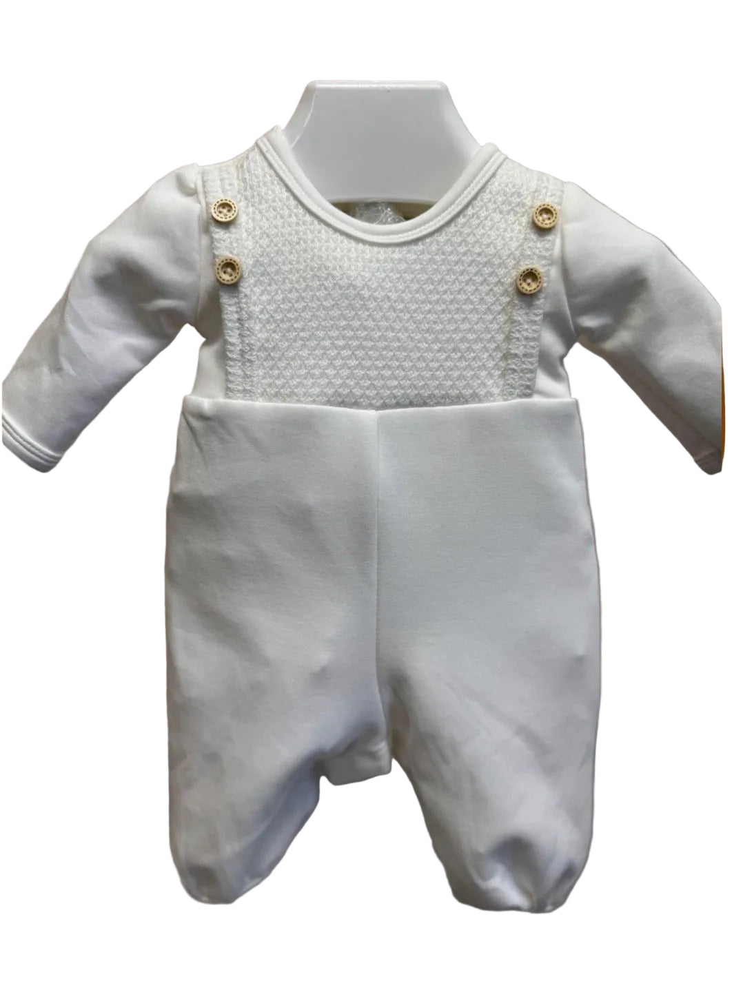 Timeless, elegant, and perfectly polished π€ This ivory one-piece romper features a soft long sleeve design with a beautifully textured knit bodice and standout decorative buttons that add a refined heirloom touch. The double-button accents along the front create a classic suspender-inspired look while keeping the piece sleek and seamless. Crafted from cozy, gentle fabric with a tailored silhouette, this romper is perfect for baptisms, portraits, special occasions, and cherished milestone moments. β¨