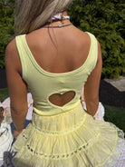 Get ready to steal hearts (and maybe a few glances) with our Yellow Heart Cutout Tank! This cheerful pastel yellow top has a playful heart cut-out in the back, perfect for showing off your fun side—because who doesn’t love a little peek-a-boo? Plus, it comes in mommy-and-me sizes, so you can match with your mini me (cute alert!). Wear it, rock it, love it!