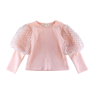 This elegant pink long-sleeve top features delicate mesh dot puff sleeves, adding a charming and sophisticated touch to any young fashionista’s wardrobe. Perfect for stylish everyday wear or special occasions.