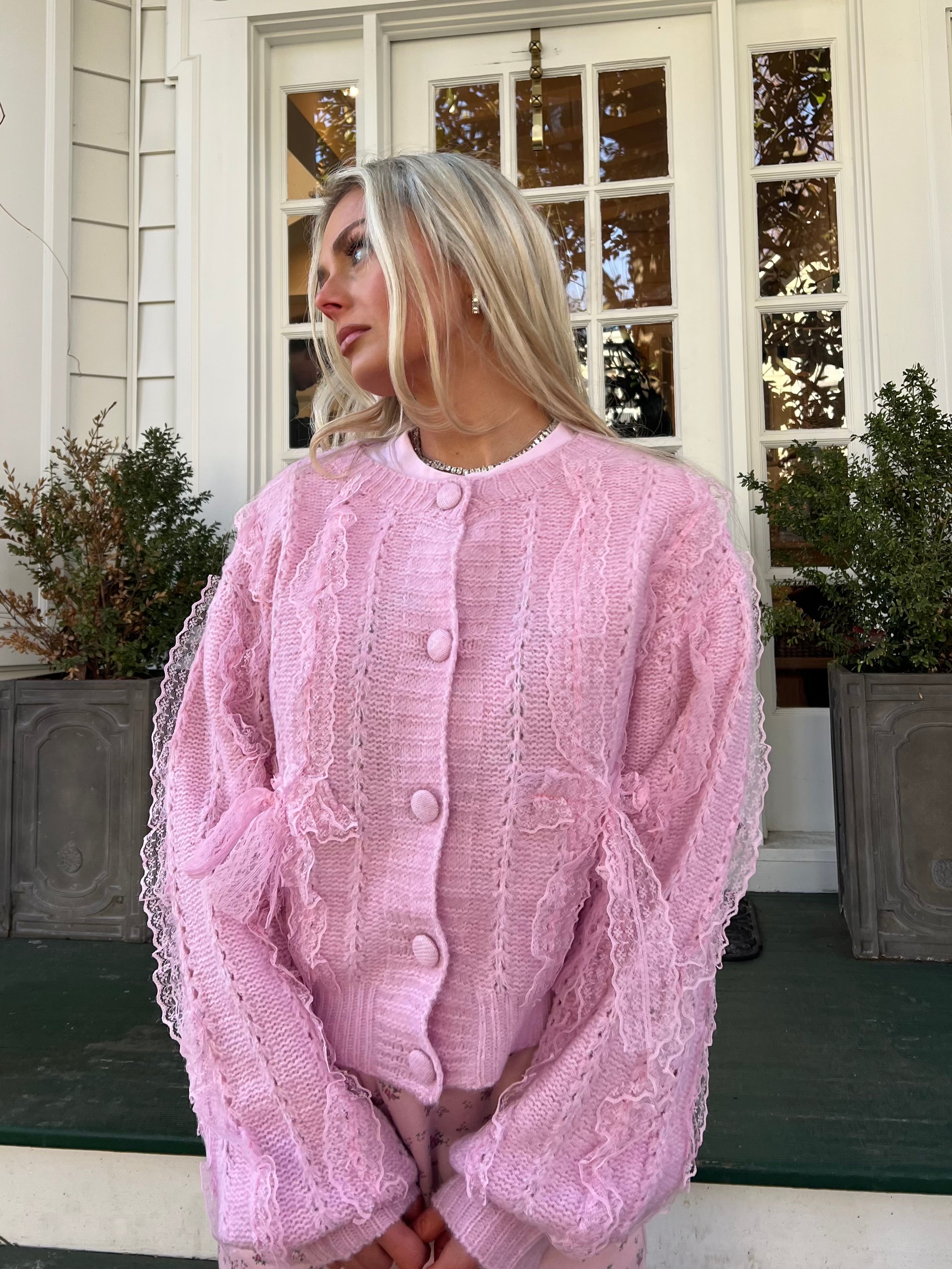 Introducing the Delaney Lace Cardigan—your new go-to for effortless elegance! This soft pink knit beauty features delicate lace bows adorning the front and sleeves, paired with a classic button-front design that's perfect for layering. Whether you're dressing up for Valentine's Day or keeping it cute on the everyday, this cardigan brings that sweet, feminine touch to any outfit. Cozy, charming, and totally swoon-worthy!