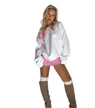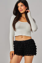 Delilah Ruffle Bloomer Shorts showcase delicate dobby tulle and lace crafted into lightweight, airy shorts. Featuring double-layer ruffle frills and a scalloped elastic waistband with a charming bow, they combine comfort with refined detail. The soft jersey lining adds a subtle touch of elegance beneath every layer.