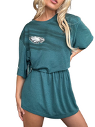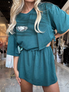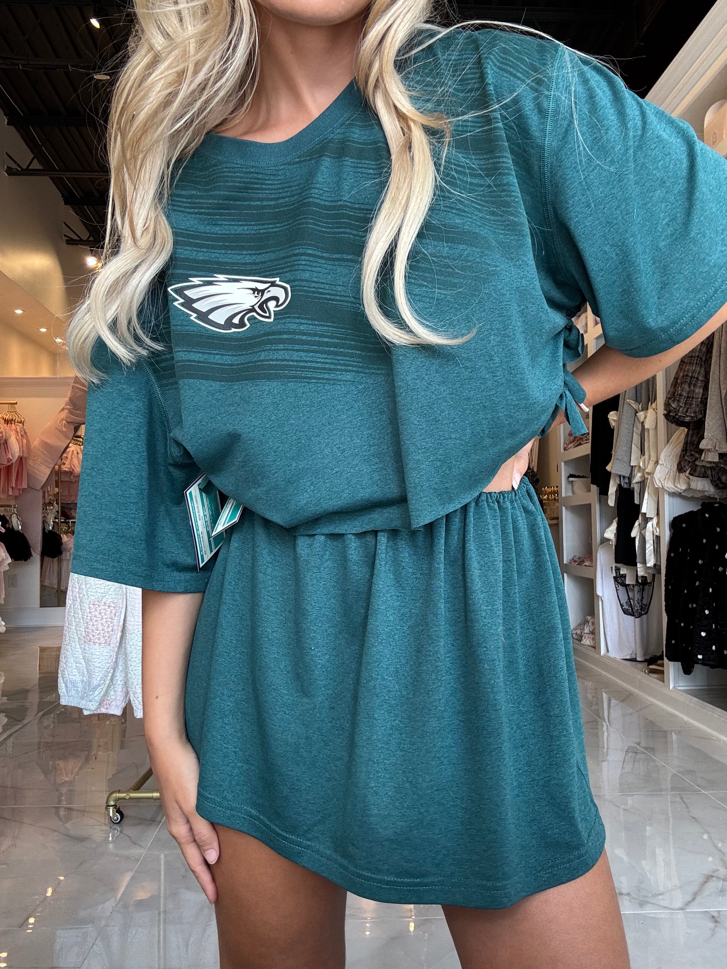 This elegant Classic Eagles Skirt Set features a crop top crafted from a Nike T-shirt with an Eagles logo and a delicate lace open back. The adjustable elastic mini skirt ensures a perfect fit for sizes S to M. Please note, this final sale item is non-returnable and non-exchangeable.