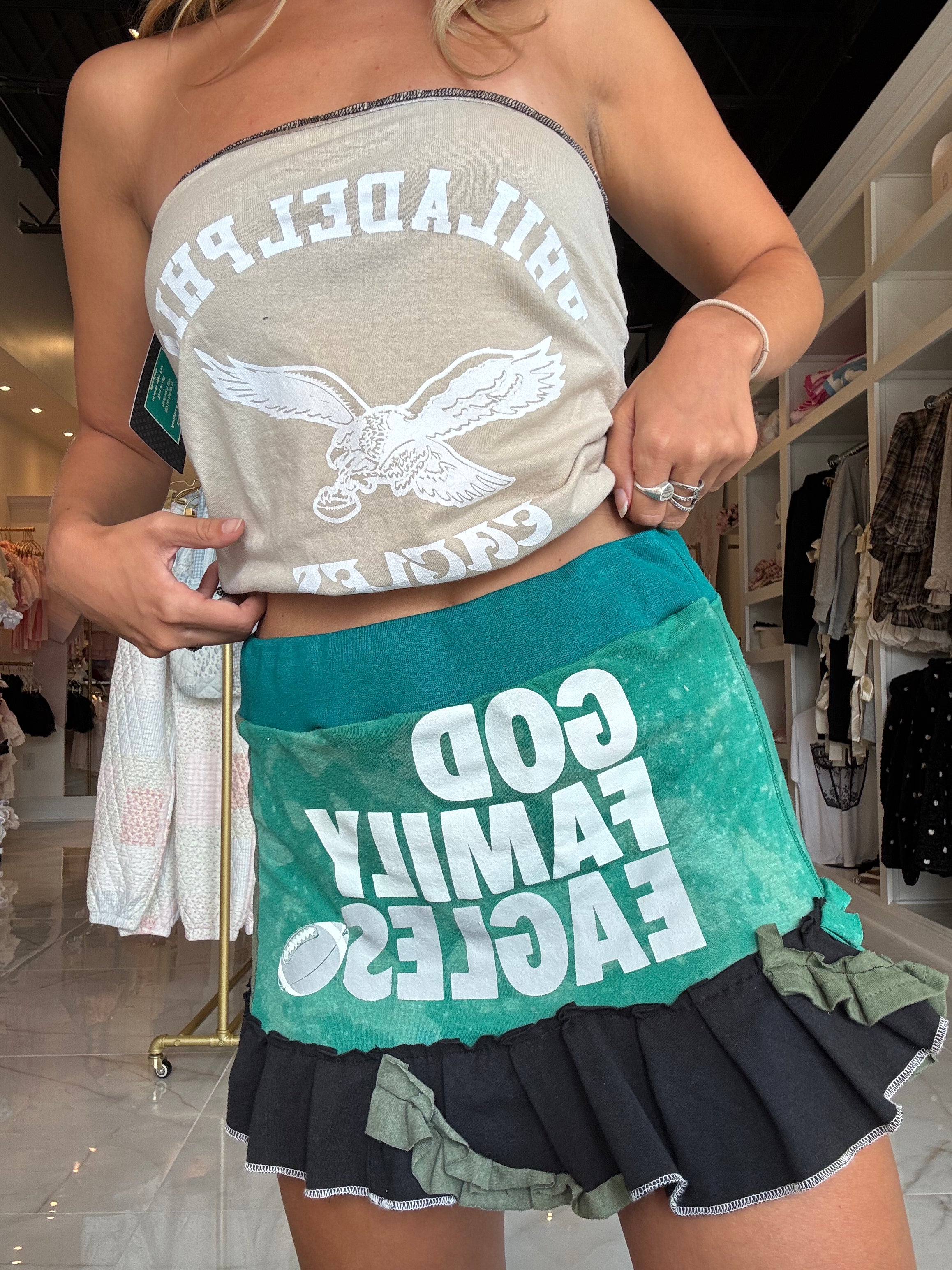 The "God, Family, Eagles" Mini Skirt features an adjustable sweatpant waistband for a comfortable, customized fit and a delicate ruffle hem for a touch of elegance. Best suited for sizes XS/S. Please note, this item is a final sale and nonrefundable.