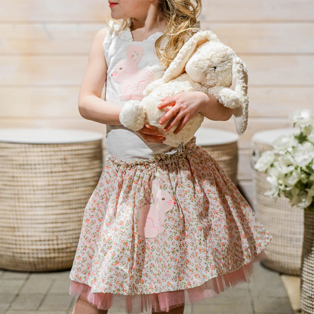 Twirl into spring with this enchanting Flora Skirt! Featuring a delicate floral print in soft blush tones, this playful piece showcases adorable pink bunny appliqués that double as functional pockets—perfect for little hands. The dreamy tulle layer adds movement and whimsy with every spin, making it ideal for Easter celebrations, garden parties, or everyday adventures. A charming essential that brings joy and imagination to any wardrobe. Available in infant, toddler and girls sizes. Designed in Minnesota.