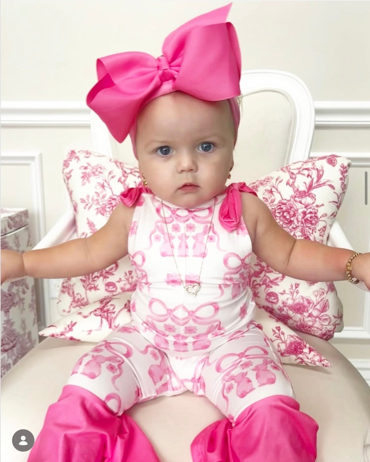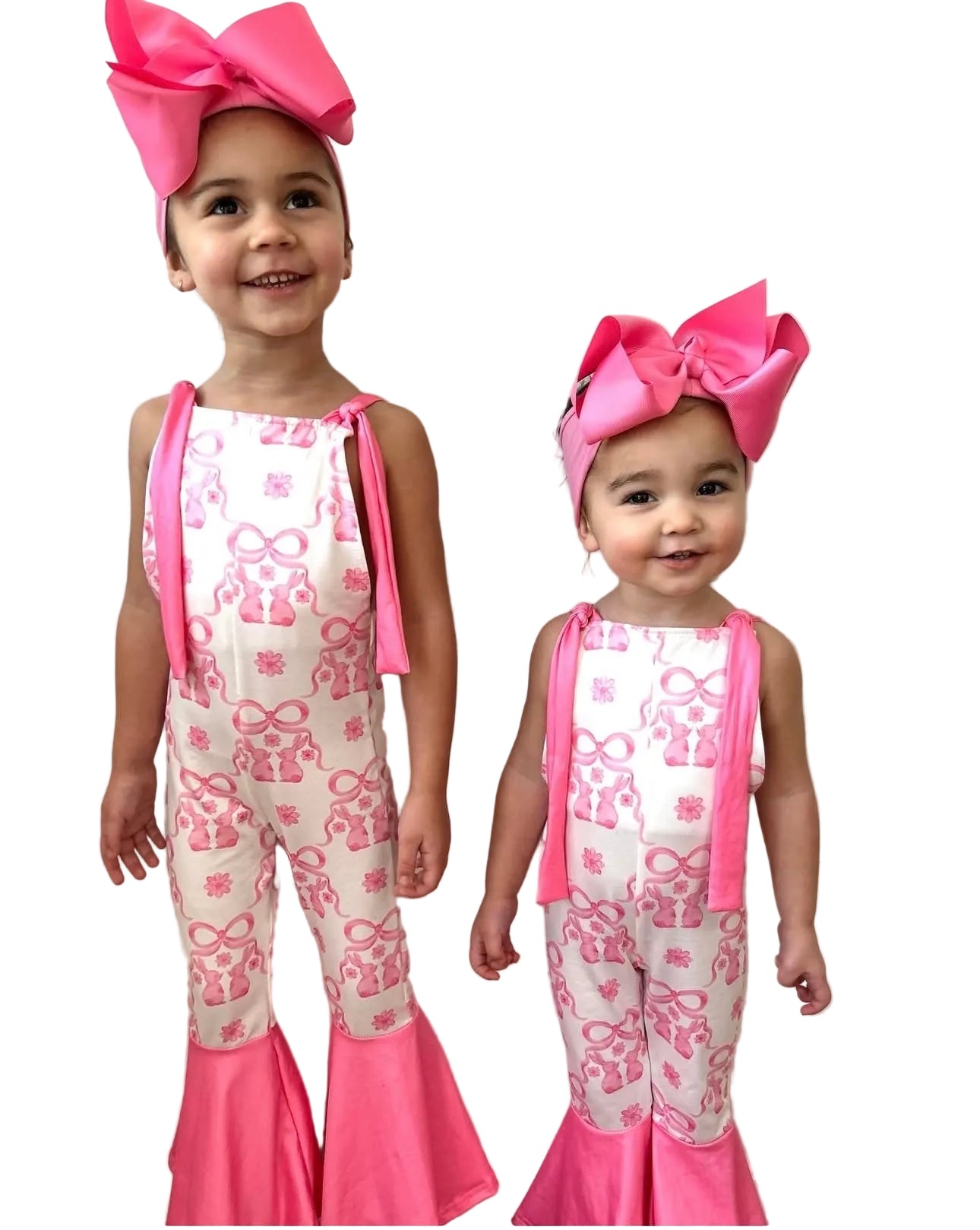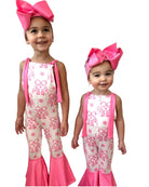 Let your little one shine in this delightful white jumpsuit adorned with a vintage Easter bunny toile print. Crafted from stretchy, breathable fabric, it moves comfortably with active play and everyday adventures. Adjustable tie straps ensure a perfect fit as she grows, while the hot pink flared bottom twirls with every step. Ideal for spring celebrations, family gatherings, or adding a touch of whimsical charm to her everyday wardrobe.