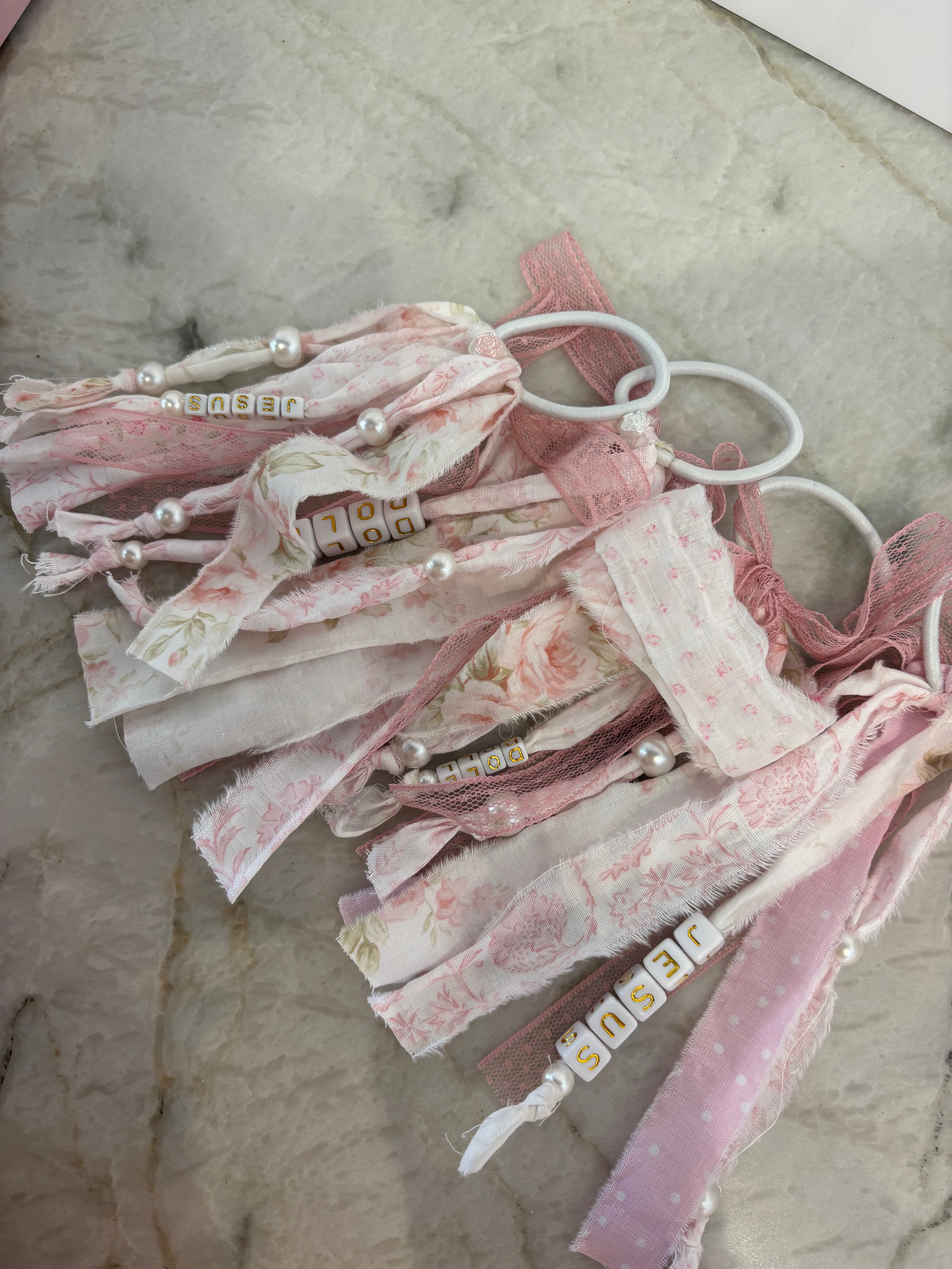 Elevate your style with our Bespoke Block Letter Hair Tie, crafted from luxurious fabrics adorned with pearls and unique decor. Choose between four elegant designs featuring large or small Jesus or doll motifs, adding a personalized and refined touch to your look. Perfect for those seeking subtle sophistication in every detail.