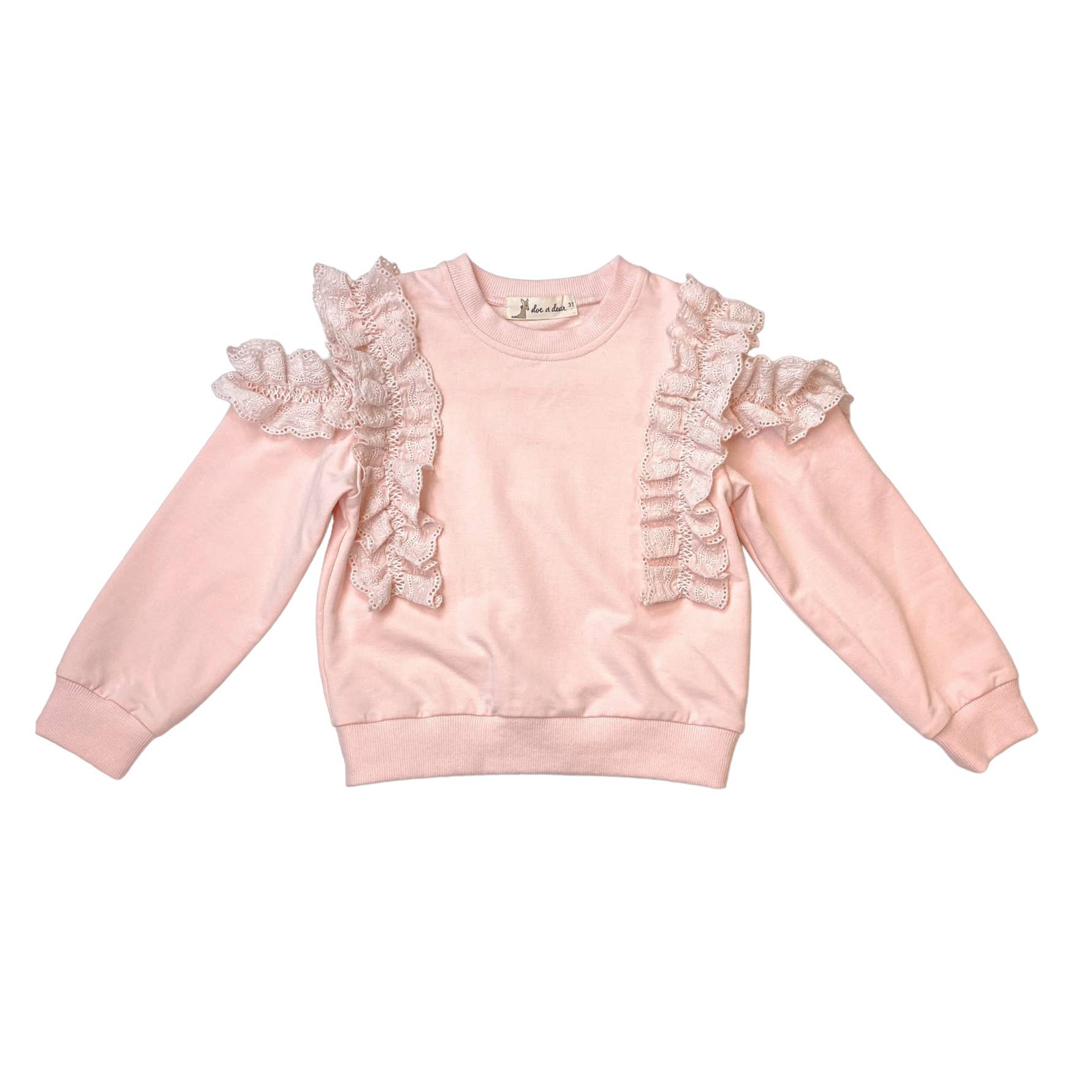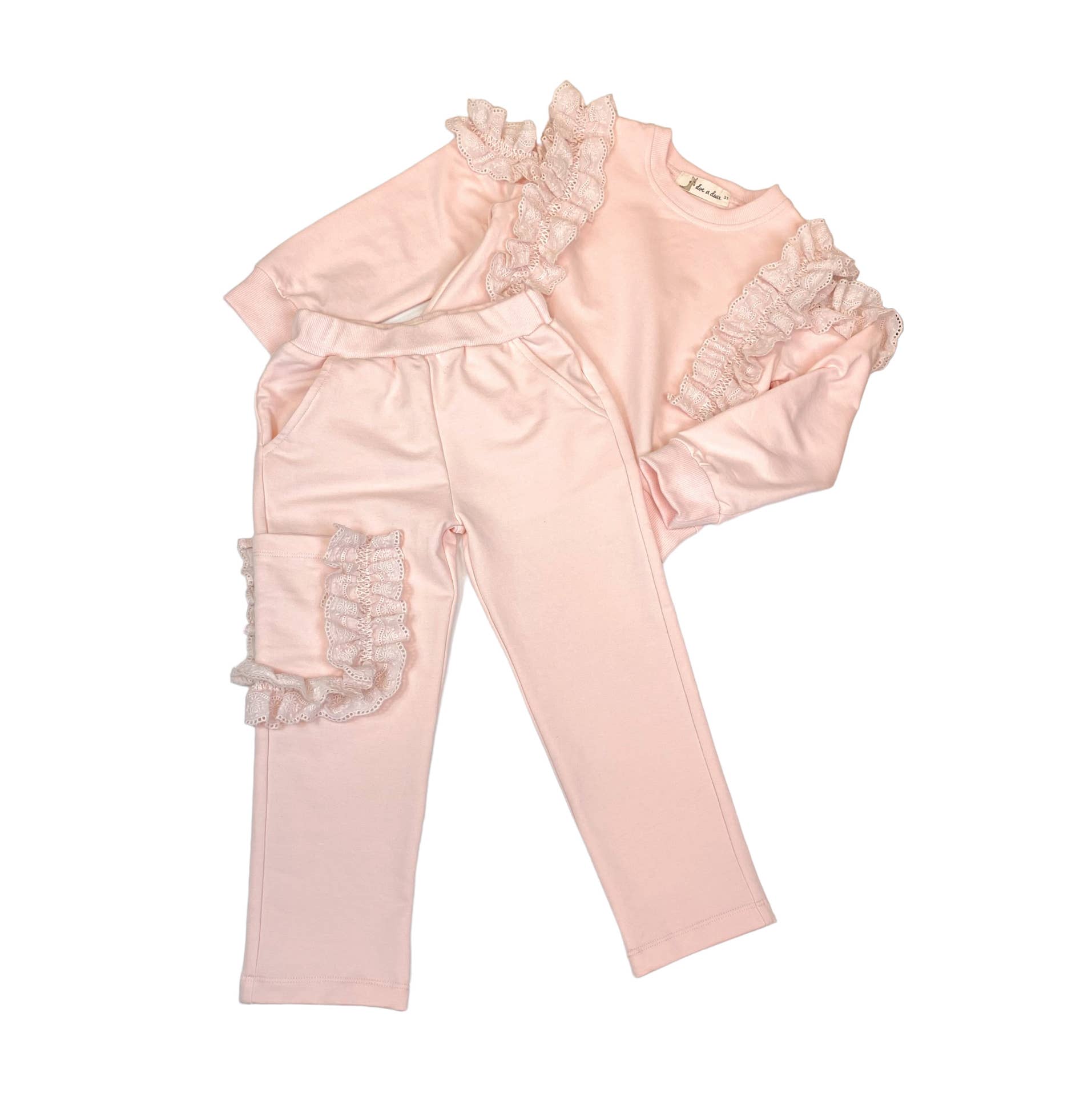 Keep your little one cozy and chic with the Olivia Lace Trim Top & Pants Set. This elegant sweatshirt features delicate lace trim and a unique open shoulder design, paired perfectly with matching joggers in a lovely pink shade. Ideal for stylish kids who love comfort and charm.