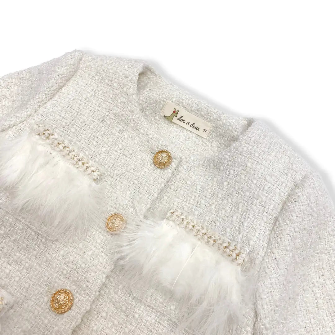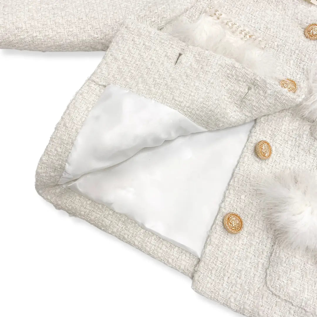 Cozy up in the Sabrina FeatherTrim Tweed Jacket, crafted with 100% polyester for ultimate warmth and softness. Fun detachable feather-trimmed pockets add a flirty touch while making washing a breeze. Available in two chic colors to brighten your wardrobe!