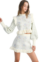 This elegant set features a long sleeve, multi-color floral print knit crop top with delicate ruffle peplum detailing, paired with a matching mini skirt adorned with a ruffle hem. Perfectly balanced between playful and sophisticated, this ensemble offers a flattering silhouette and vibrant charm for any occasion.