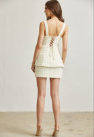 Elevate your wardrobe with the Audrey Tweed Dress, crafted from soft tweed fabric featuring delicate checker frayed detailing. This elegant ensemble showcases a refined square neckline and is adorned with a sparkling rhinestone bow accent trim. Subtle tiny ribbon trims add a touch of sophistication throughout, while the peplum hip detail enhances your silhouette. A discreet side zipper closure ensures a seamless fit, making this set perfect for polished, graceful occasions.