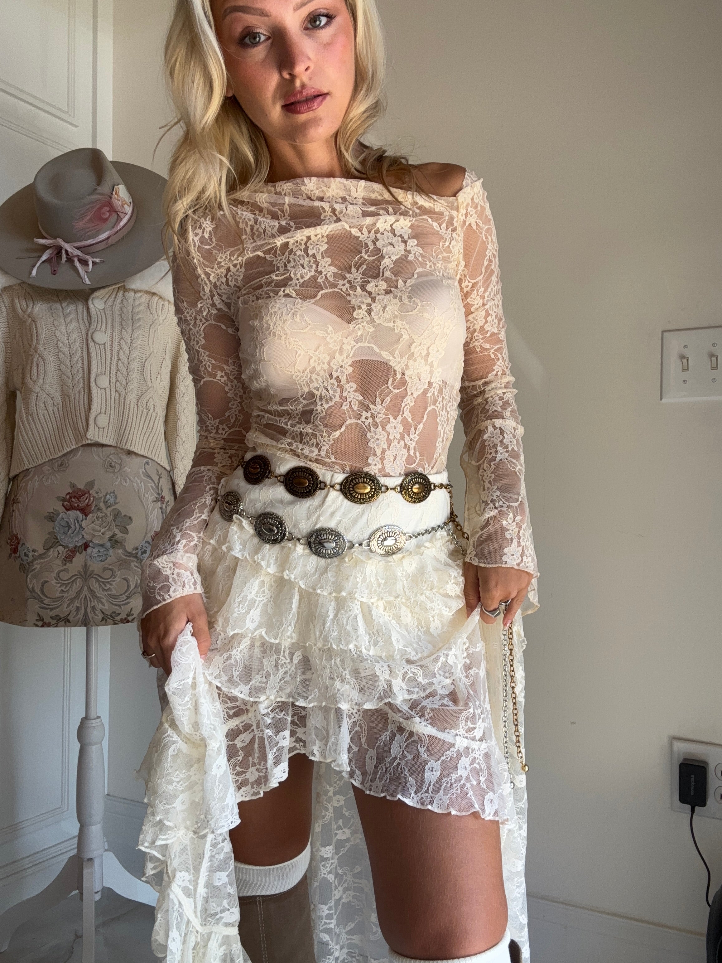 Elevate your wardrobe with the Belle Sheer Lace Top, featuring delicate lace accents on the shoulders and gracefully flared sleeves. This elegant design combines a subtle transparency with refined detailing for a sophisticated, flattering look perfect for any occasion.
