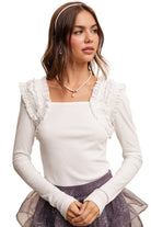 The Grace Ruffle Long Sleeve Tee features a chic square neckline that beautifully frames the collarbone. Delicate ruffle detailing along the shoulders adds a romantic, feminine touch, while the long sleeves offer elegant coverage. Crafted from soft, stretch rib fabric, this tee ensures a comfortable, flattering fit. Its versatile design effortlessly transitions from casual to dressy, making it a refined addition to any wardrobe.