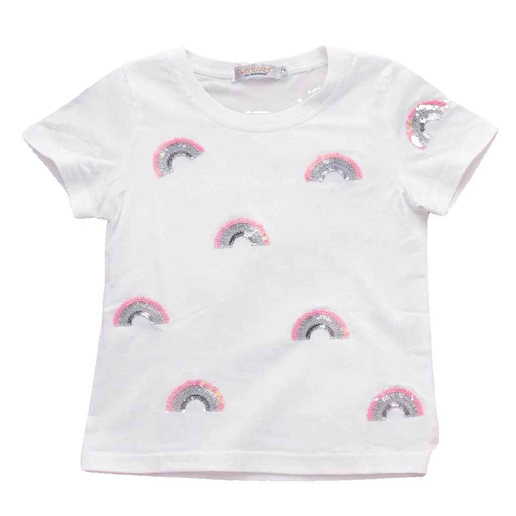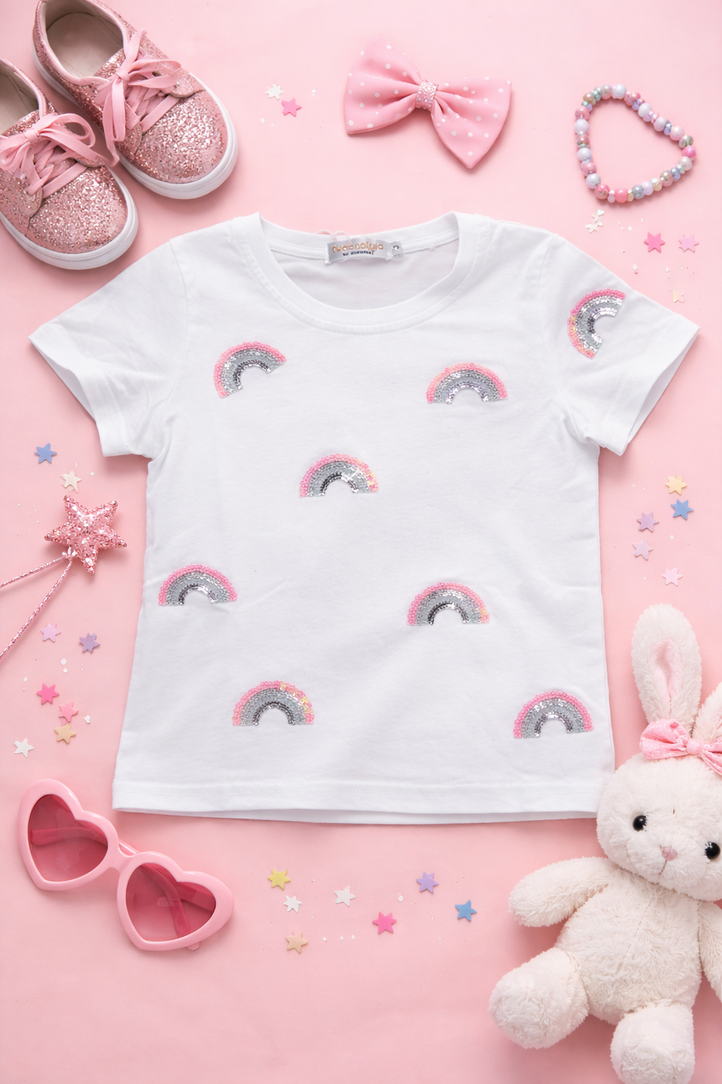 Sparkle and shine in this playful short sleeve top featuring vibrant sequin rainbows scattered throughout. Crafted from soft, breathable jersey material, it's the perfect pick for adding a pop of color and personality to your everyday look. Whether you're dressing up for a night out or keeping it casual, this fun piece brings instant joy and a touch of magic to any outfit.
