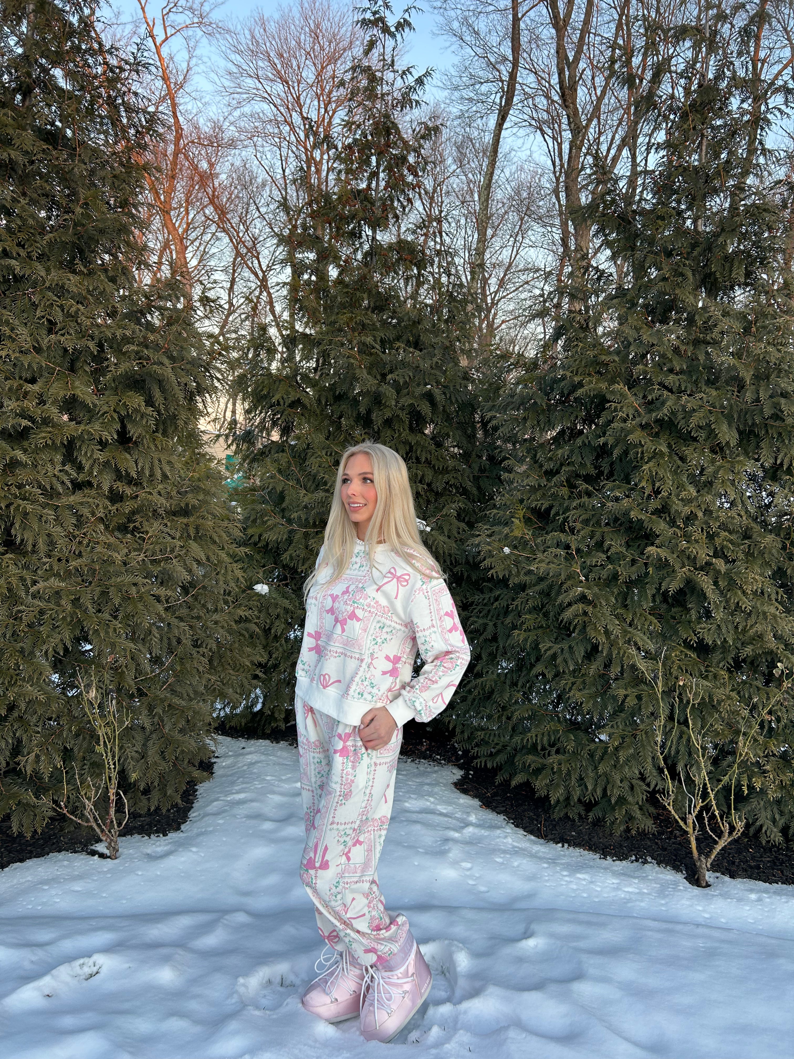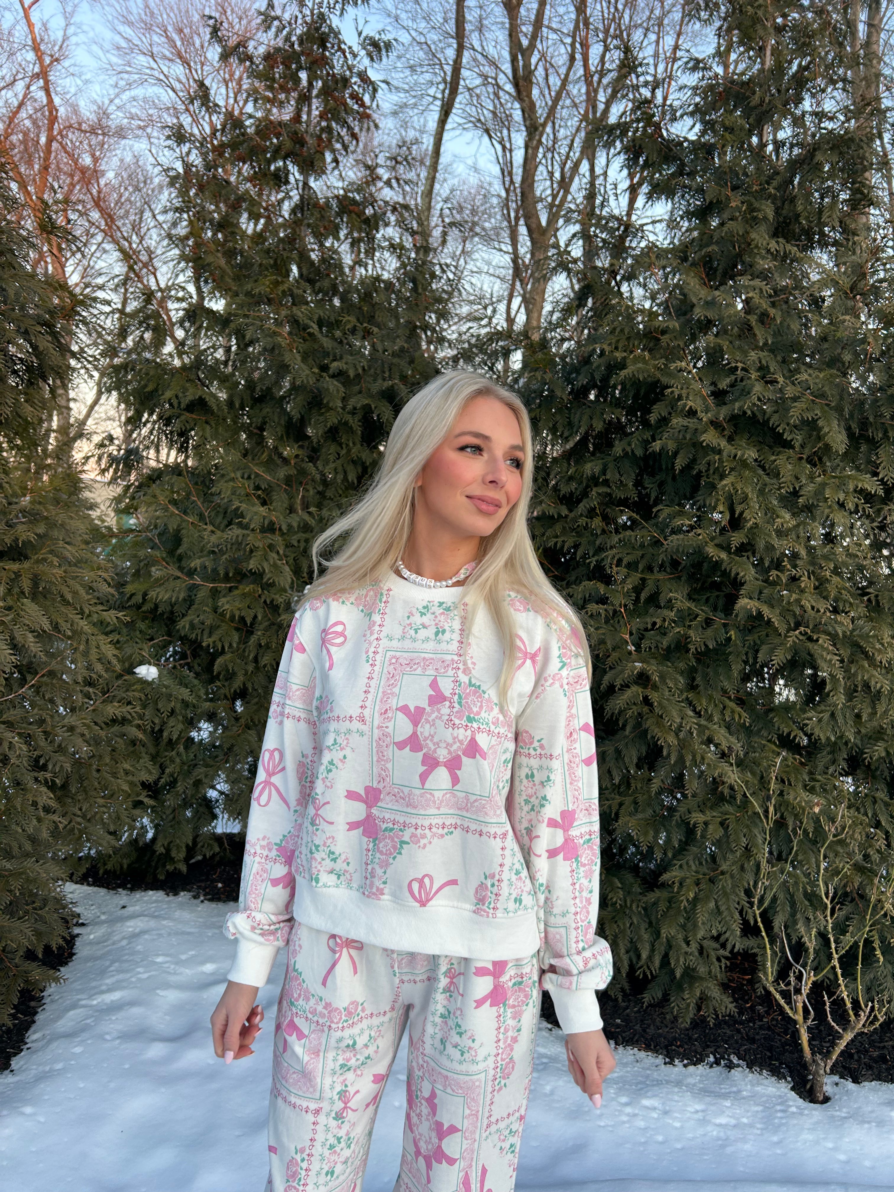Cozy up in our Brooke Bow Patchwork Lounge Set—the ultimate combo for staying cute and comfy! This adorable set features a soft long-sleeve crew neck sweatshirt paired with matching joggers, all decked out in a playful bow patchwork print. Elastic waist and ankle cuffs keep everything perfectly snug for lounging, running errands, or just vibing at home. Your new go-to for effortless style!