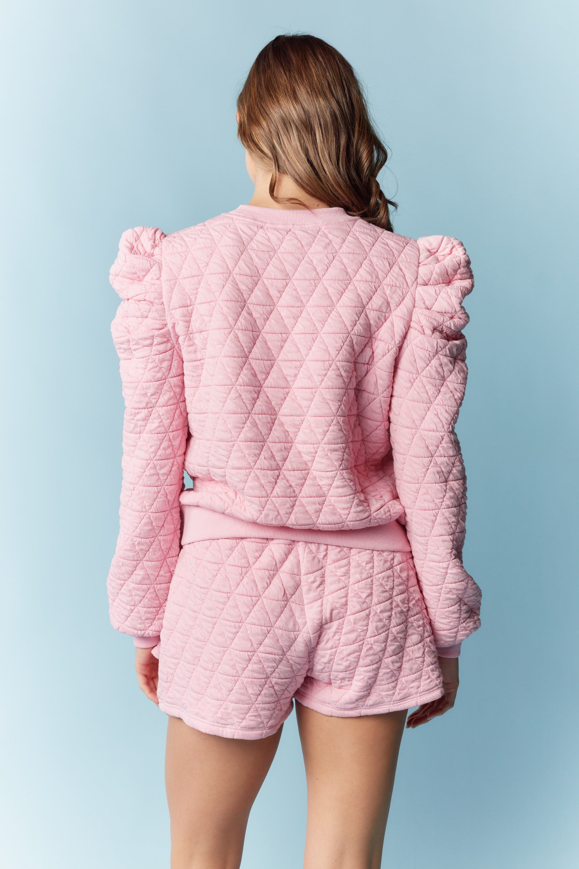 This Aurora Quilted Puff Sleeve Skort Set features a unique quilted pattern with a long-sleeve top and playful puff sleeves. The matching shorts have an adjustable drawstring waist for a comfy, flattering fit. Soft like your favorite sweatshirt but cuter and more feminine—perfect for stylish, cozy days!