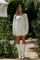 Elevate your wardrobe with the Eloise Sweater Dress, featuring an oversized front bow that adds a sophisticated touch to its cozy knit fabric. This mini dress effortlessly combines comfort and elegance, making it perfect for stylish occasions or chic everyday wear.