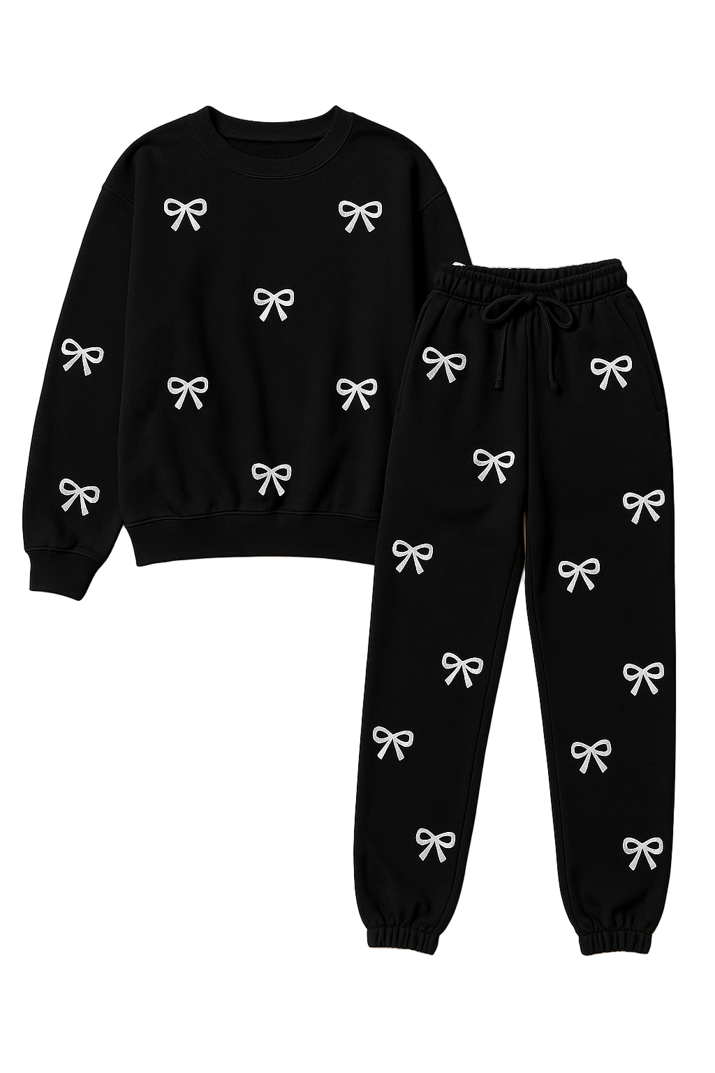 Slip into pure comfort with our Celeste Beaded Bow Lounge Set in black. This adorable two-piece features delicate beaded bows that add a touch of sparkle and charm to your downtime look. Elastic cuffs at the sleeves and ankles keep everything perfectly in place while you relax. Perfect for cozy nights in or lazy mornings—because loungewear should be as cute as it is comfy!