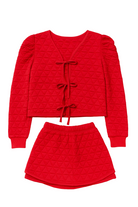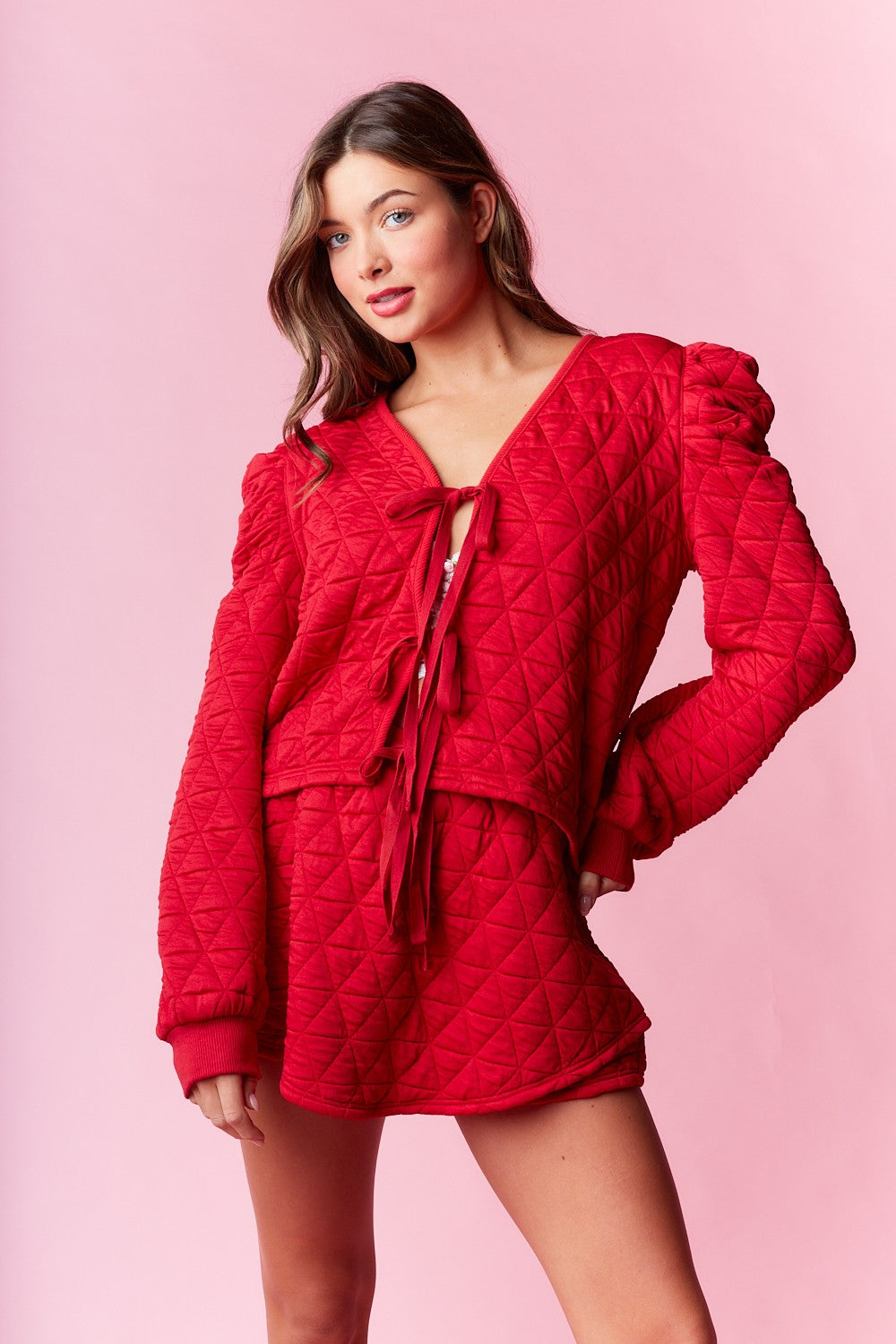 Get cozy in style with the Clarice Quilted Skort Lounge Set! This adorable two-piece features a relaxed-fit top with dramatic puffed shoulders and diamond quilting for that perfect blend of comfy and chic. Tie it up front for a playful touch, then slip into the matching shorts with an adjustable drawstring. Whether you're baking holiday treats, holiday light gazing, or just lounging around, this set keeps you looking effortlessly fabulous all season long.