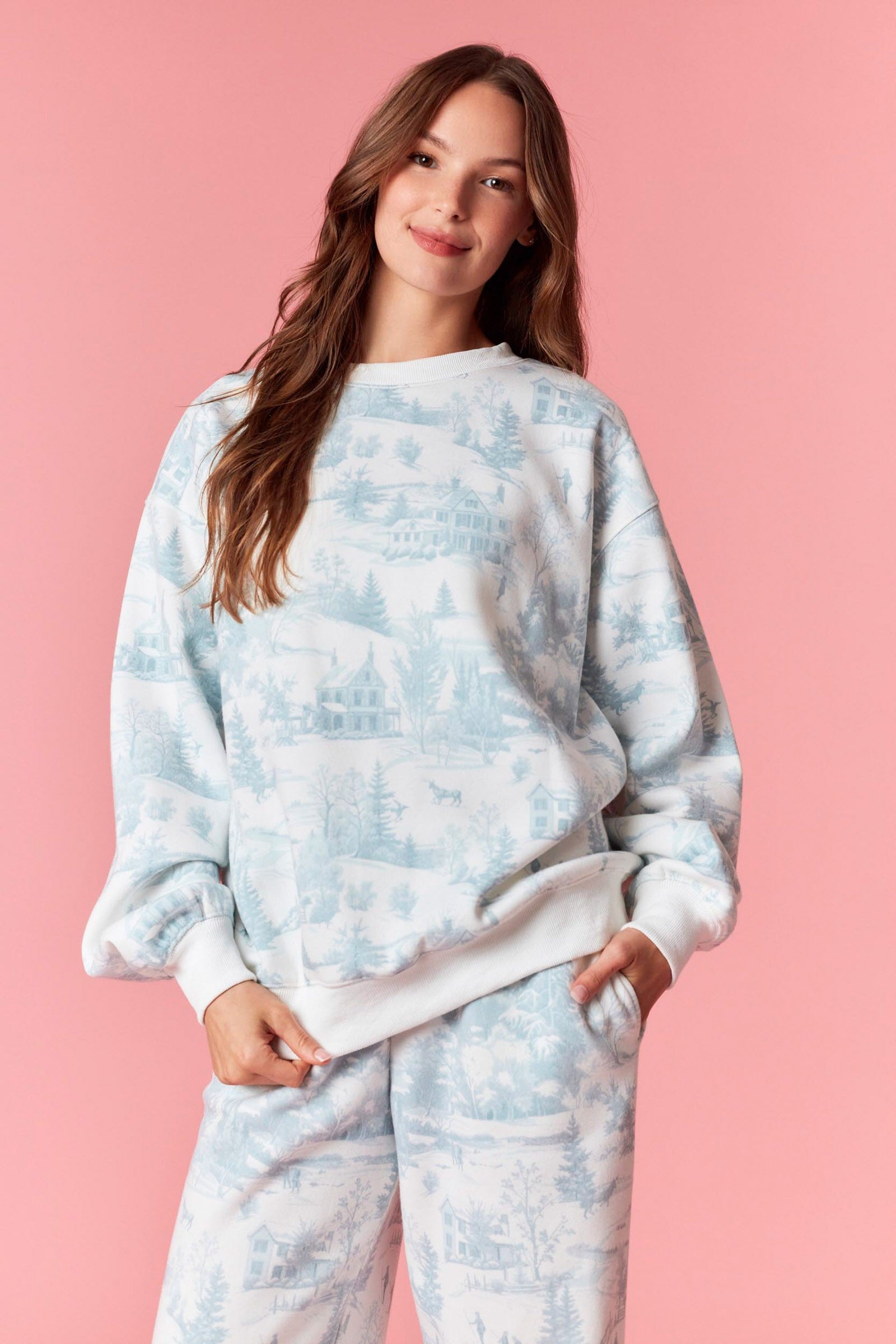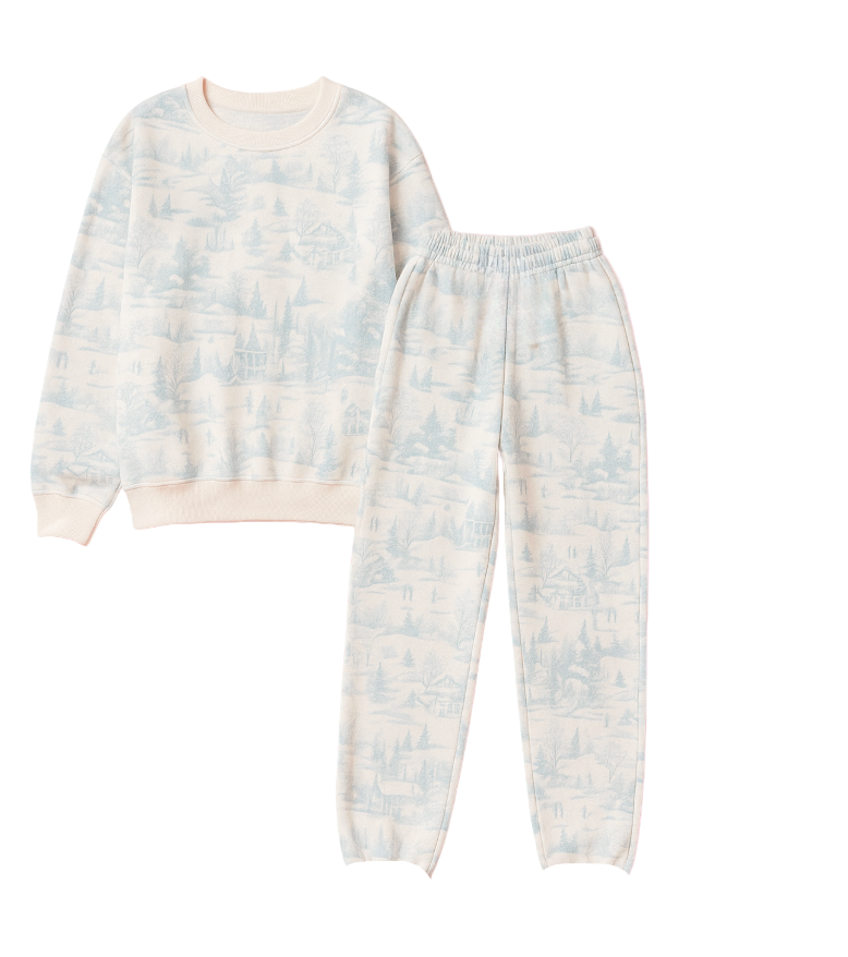 Wrap yourself in cozy winter magic with this adorable lounge set featuring a charming winter wonderland toile print on soft baby blue. The matching sweatshirt and sweatpants combo delivers that perfect blend of girly style and all-day comfort—ideal for lounging at home or casual outings. Snuggle up in fleece terry fabric that's as soft as it is stylish. Your new favorite winter essential awaits!