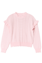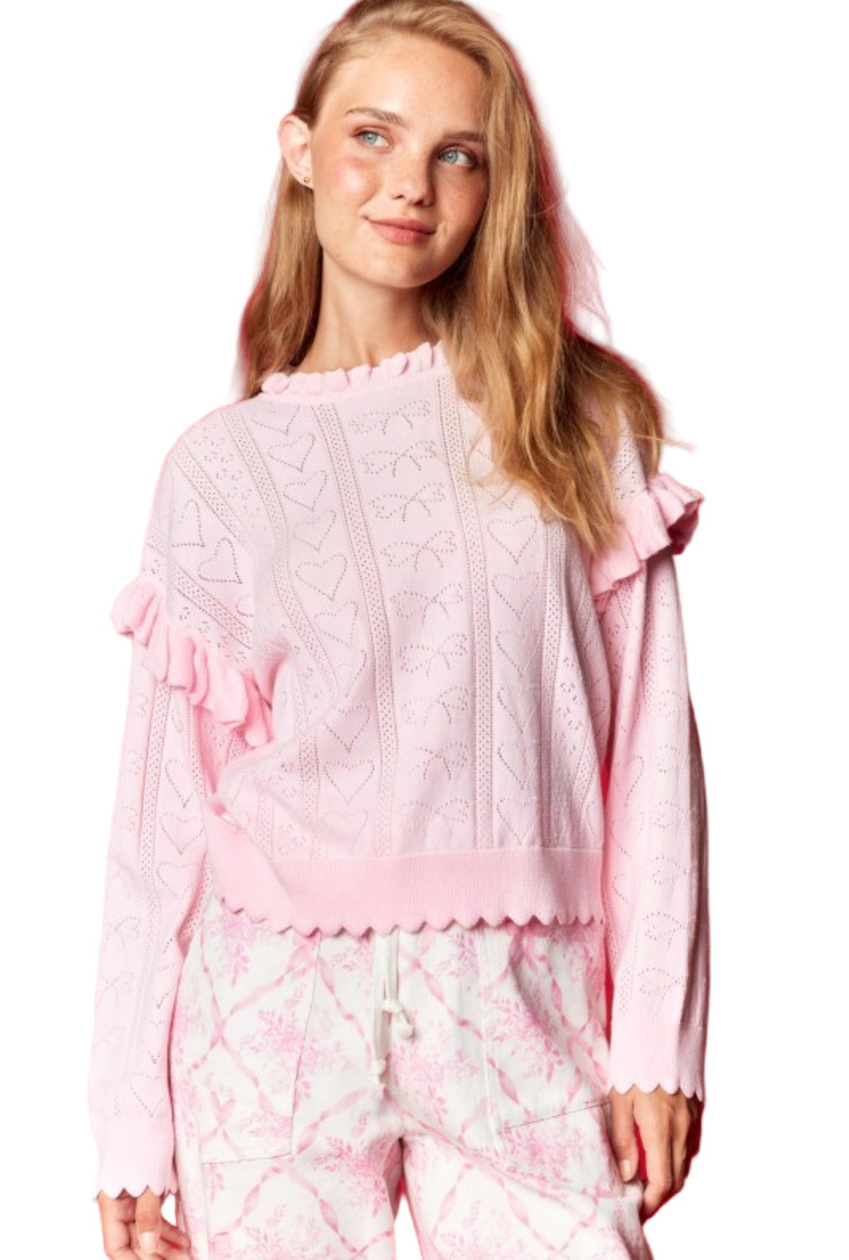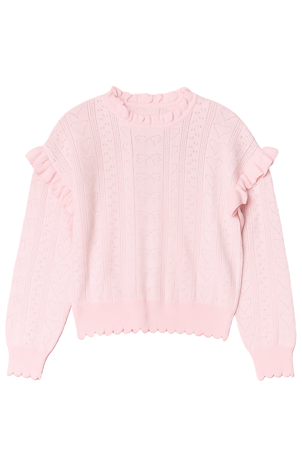 A dreamy blush-pink knit sweater featuring delicate heart-pointelle detailing and soft ruffled accents along the shoulders. Finished with scalloped hems and a cozy relaxed fit, it’s the perfect blend of sweet and chic.