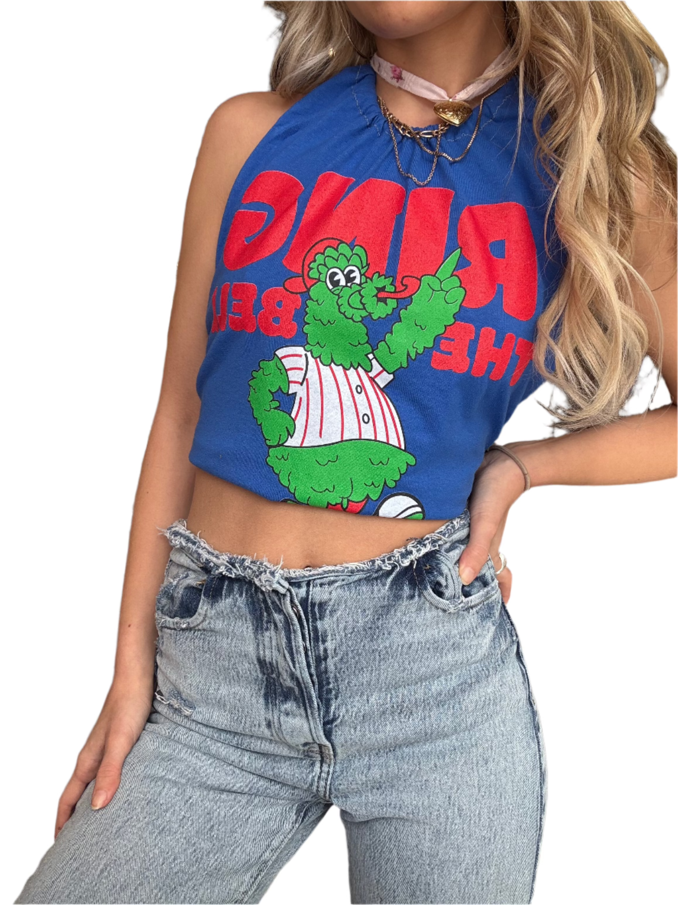 Get ready to show some team spirit with our playful and vibrant Ring the Bell Phillies Halter Top! This blue halter top boldly displays the "Ring the Bell" logo, making it the perfect addition to any game day outfit. Let your fun and quirky side shine while cheering on your favorite team.