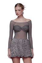 The Stardust Mesh Bodysuit is a sleek, ethereal statement piece crafted from whisper-soft sheer mesh that glides effortlessly over the skin. Designed with an elegant off-the-shoulder neckline, it highlights the collarbone with a refined, ballet-inspired silhouette. The sculpted, twist-front bust is delicately dusted with micro-crystals, creating a subtle constellation-like shimmer that catches the light with every movement. Sophisticated, modern, and undeniably feminine, this bodysuit elevates any evening look—pair it with sequins, satin, or tailoring for an instantly luminous, high-fashion finish.