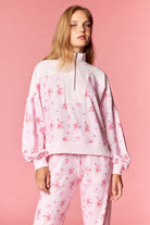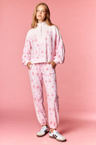 The Deanna Floral & Bows Lounge Set is your new go-to for cozy style. Featuring a soft terry fabric with a charming pink floral and bow print, this set includes a relaxed quarter-zip top with balloon sleeves and ribbed cuffs, paired with joggers that have a comfy elastic waistband and side stripes. Lightweight and ultra-cute, it’s perfect for lounging in girly comfort!