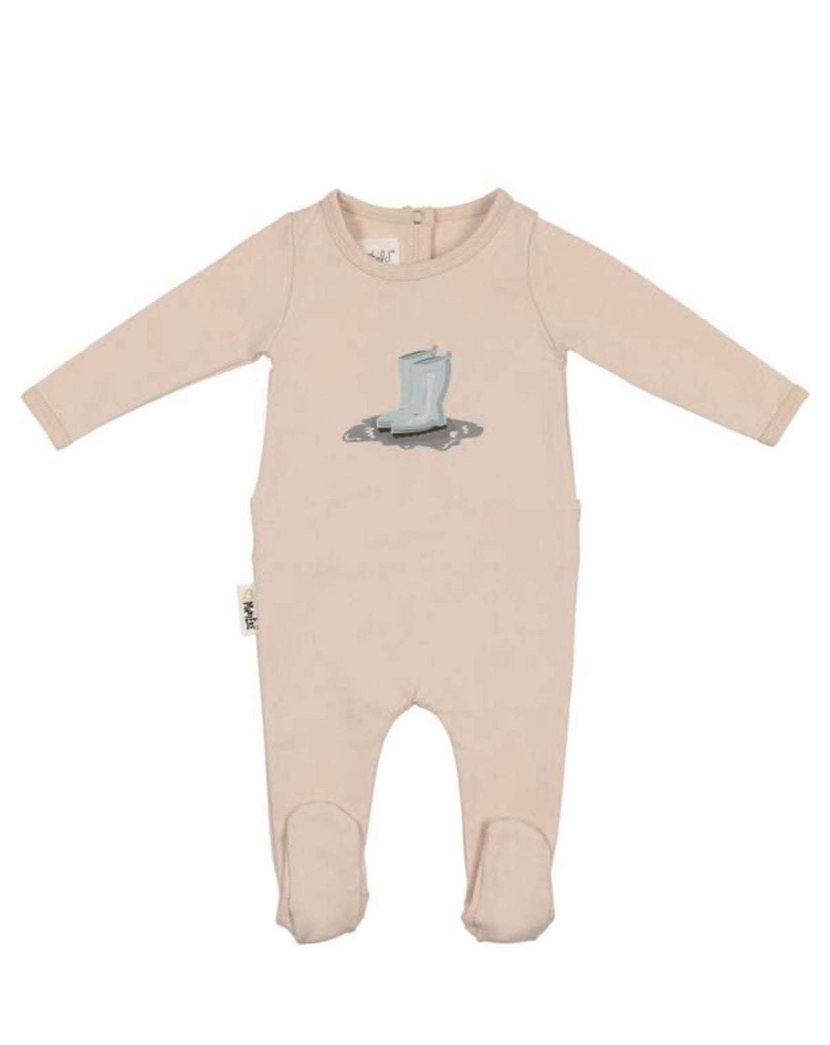 Playful and cozy, this neutral beige romper is brought to life with a charming illustration of little rain boots splashing in a puddle. With footed legs and long sleeves for all-day comfort, it’s perfect for keeping baby snug while adding a touch of whimsy to their wardrobe. A delightful choice for everyday wear, gifting, or those rainy-day snuggle moments.